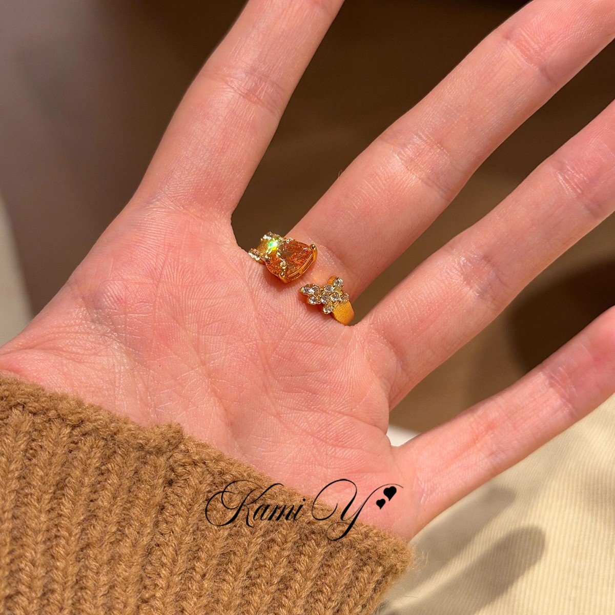 金色拉丝水滴橙色闪钻戒指女轻奢小众设计高级感食指戒独特指环