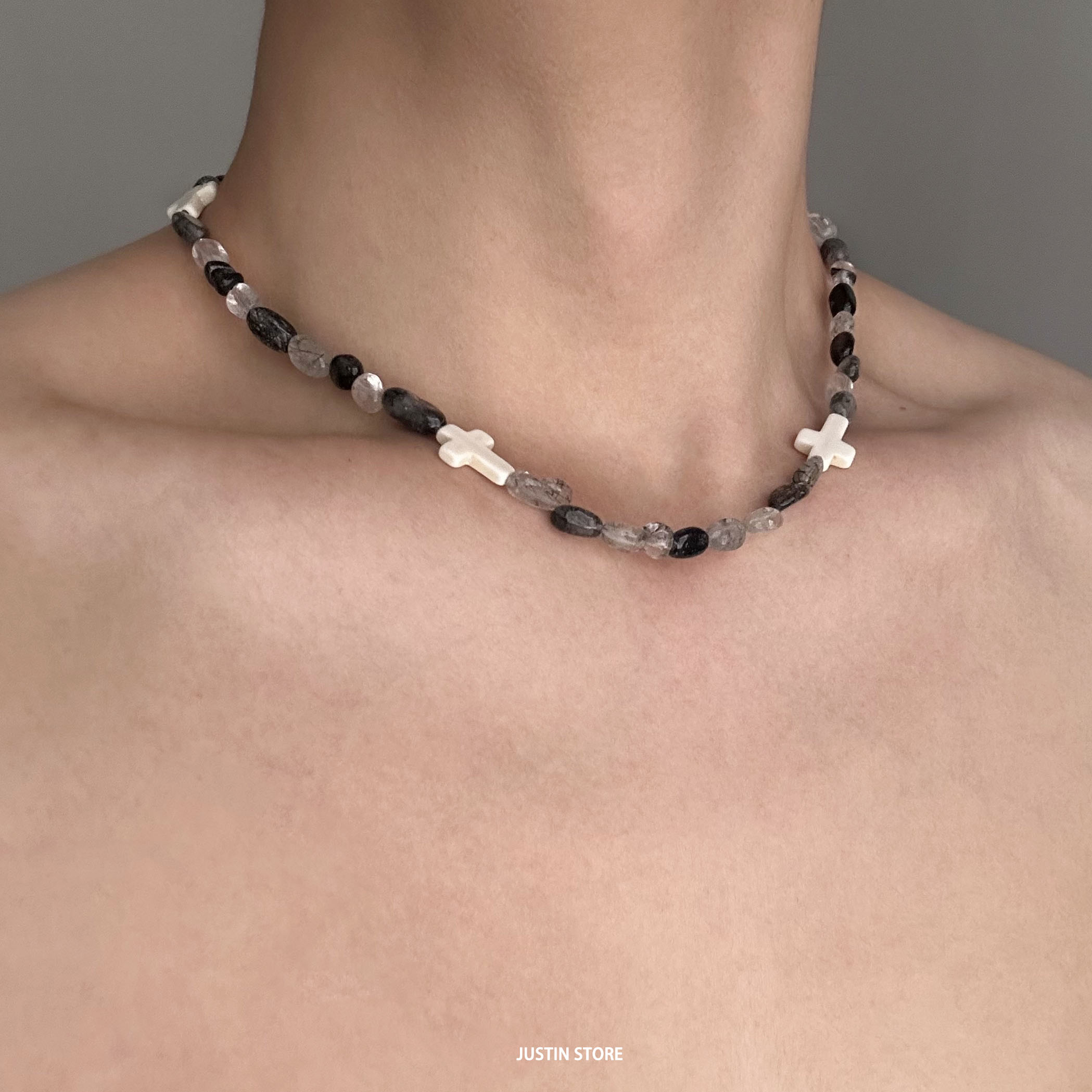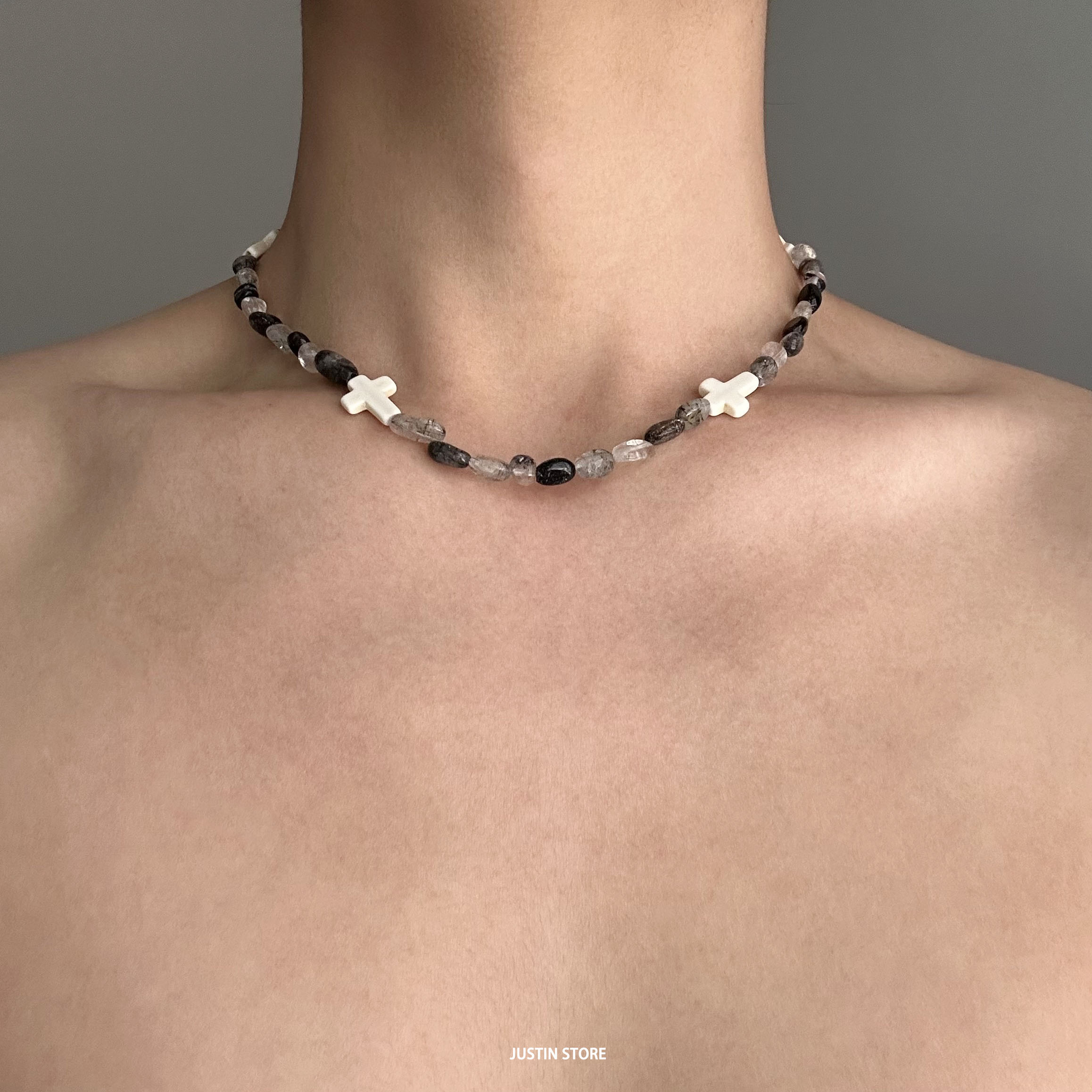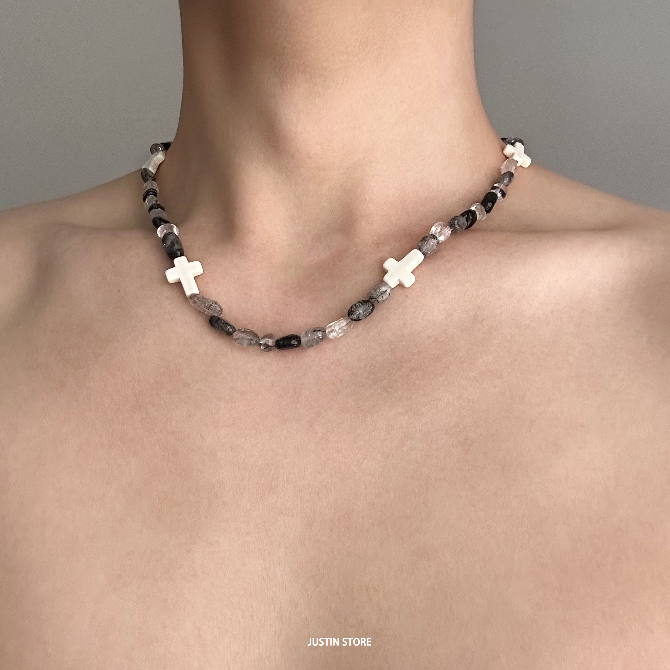 黑色拼接十字架串珠项链男款暗黑冷酷风设计感锁骨链个性百搭配饰