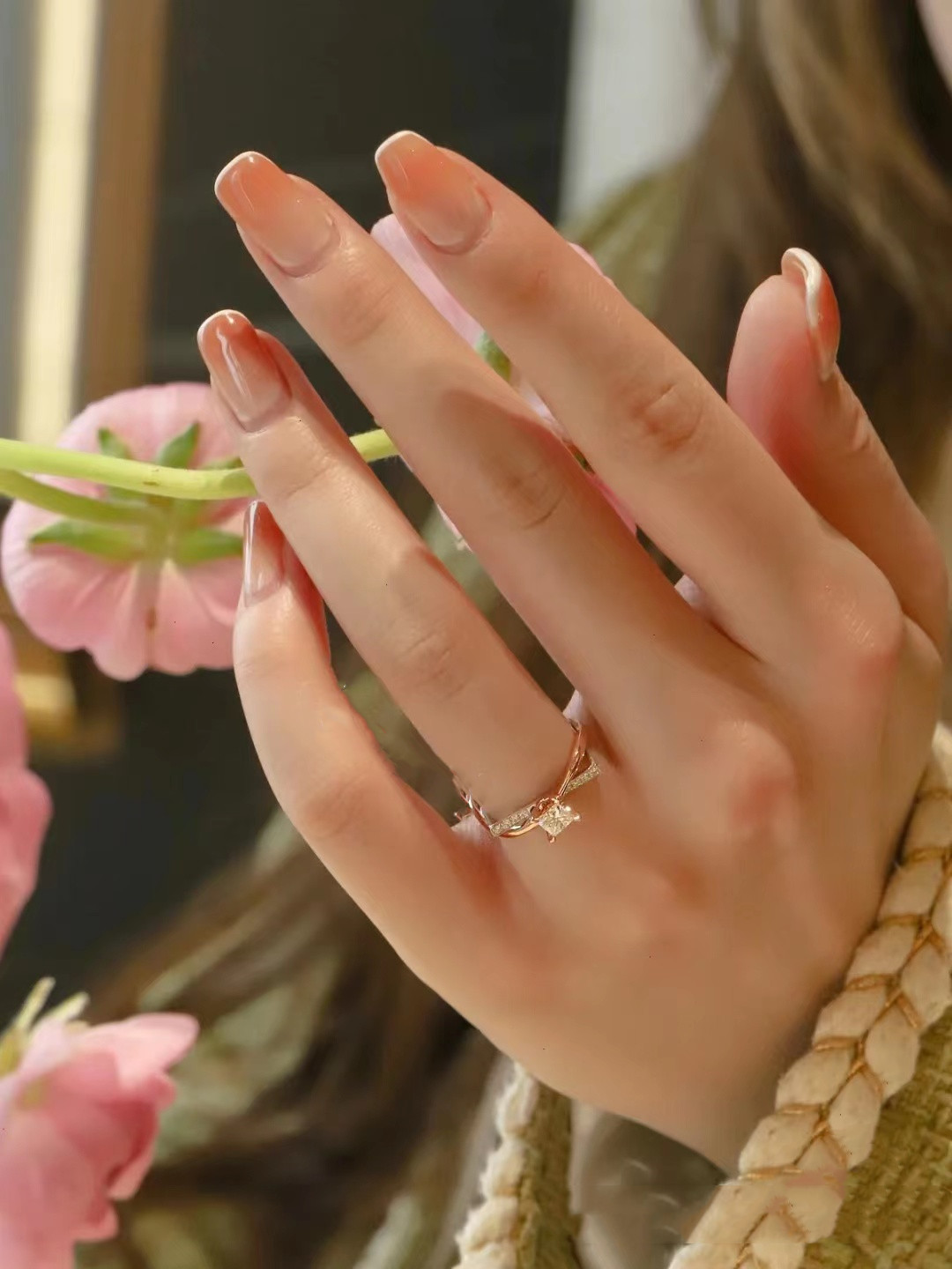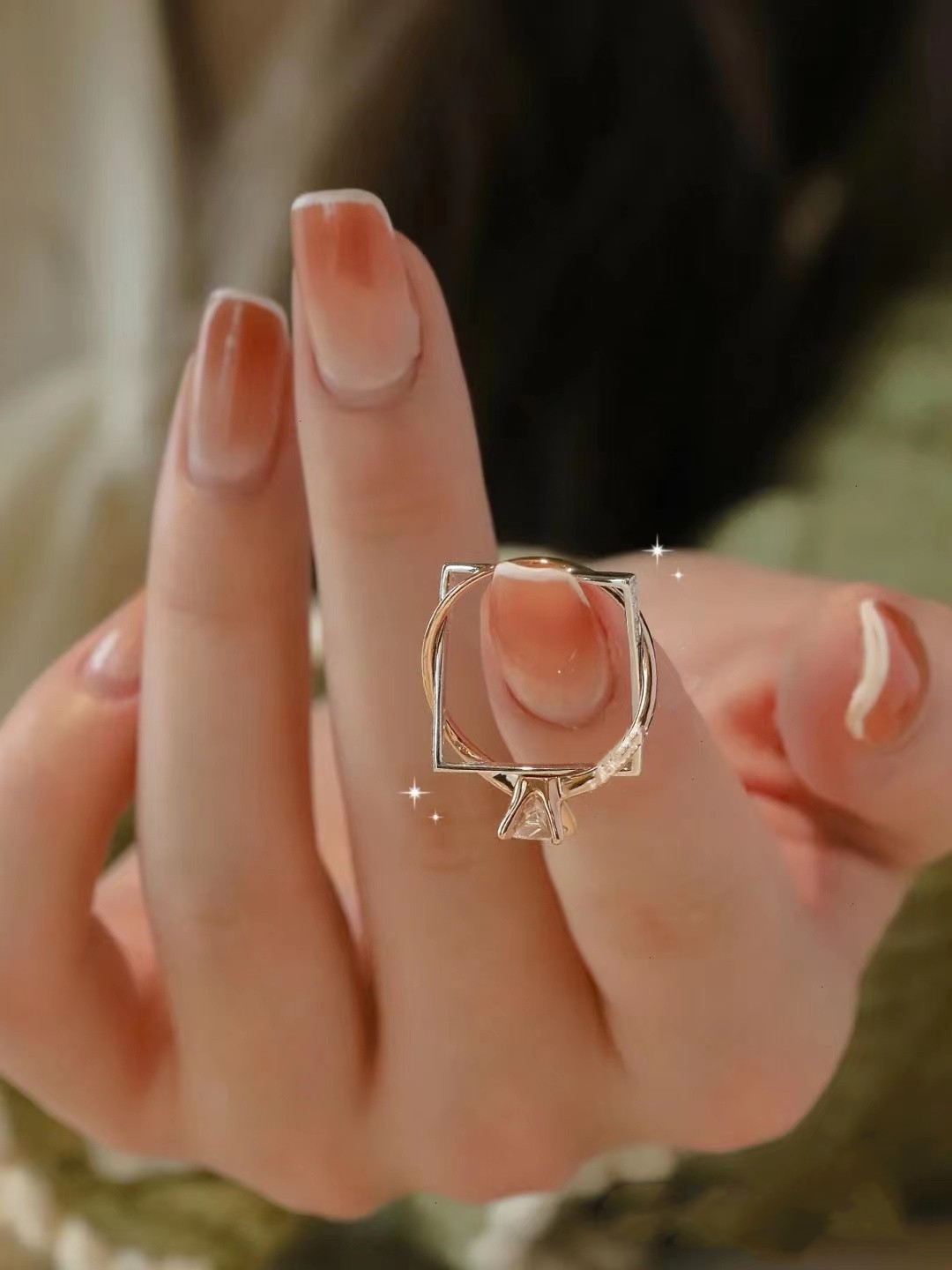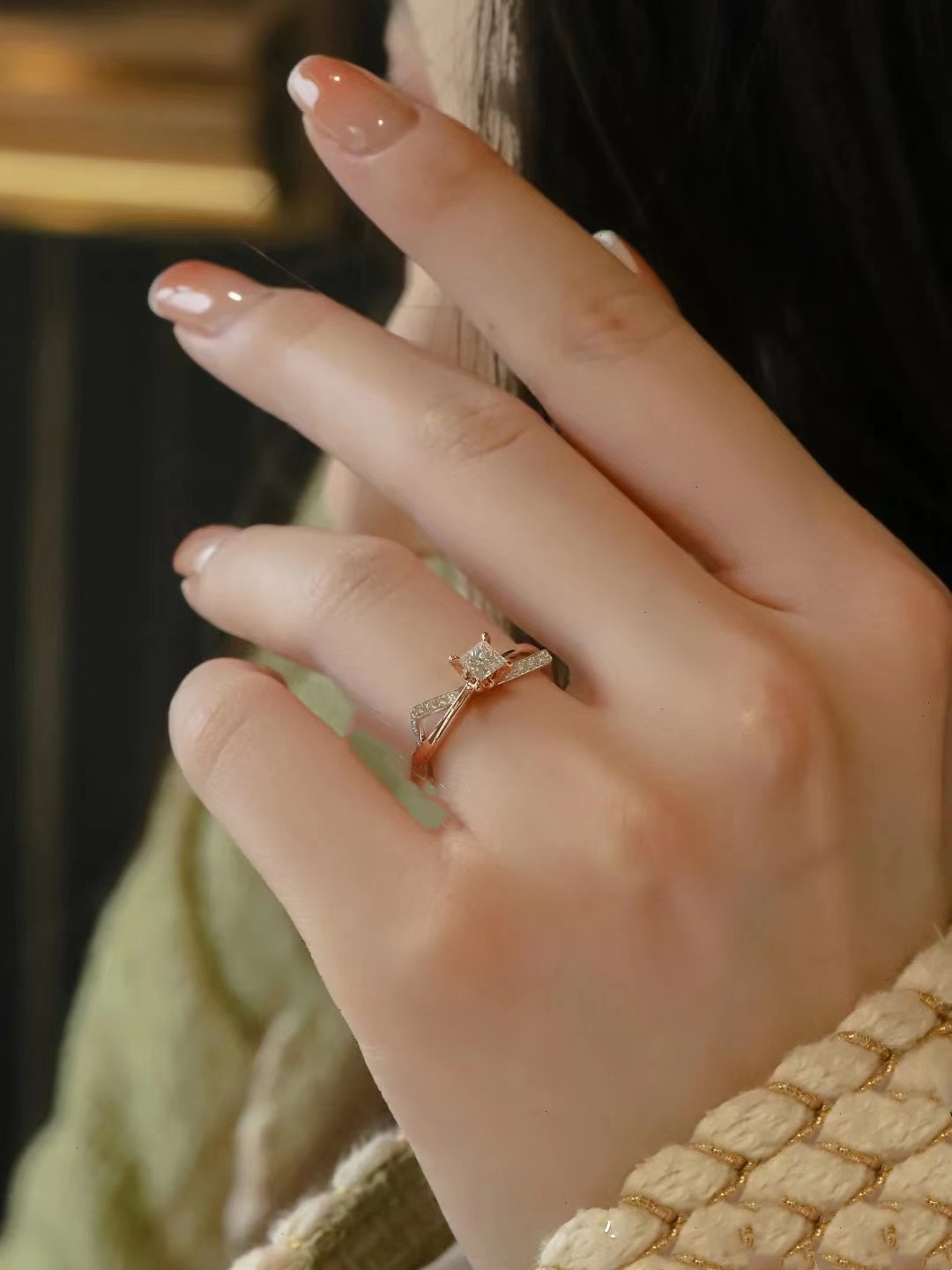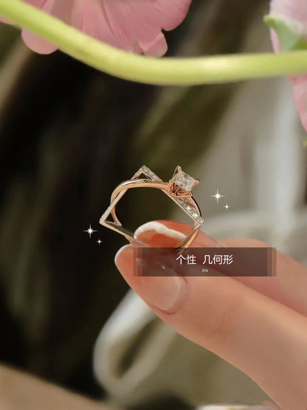 高级感原创设计方圆情人节订婚指环个性分色玫瑰金钻石闭口戒指女