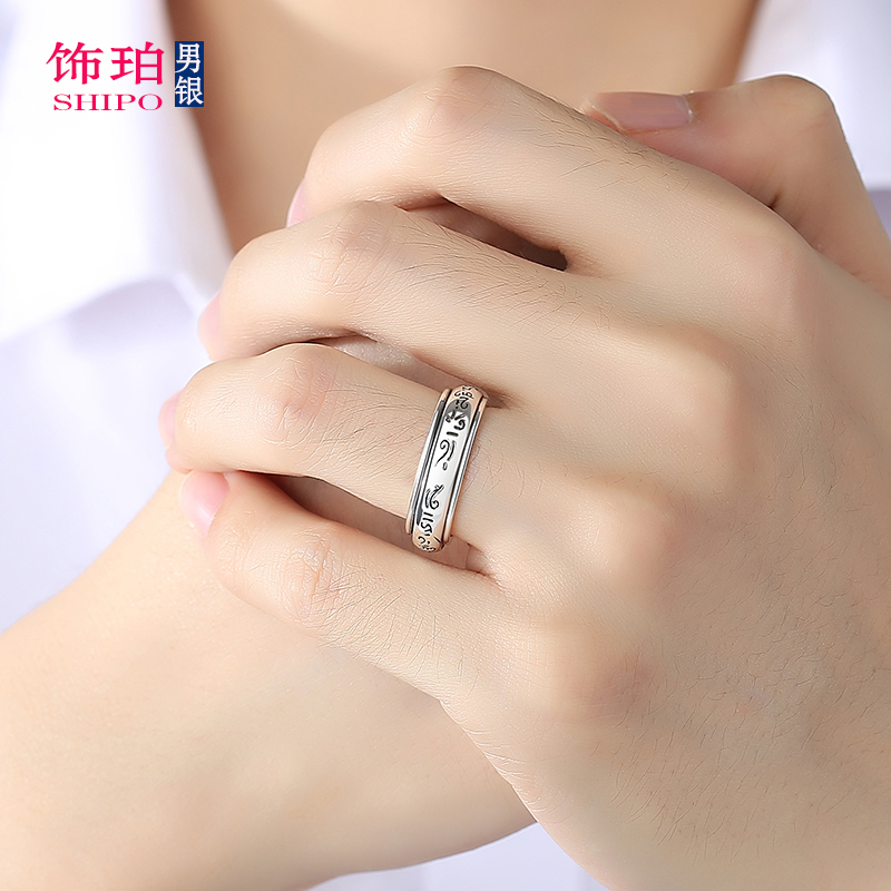 可转动 925纯银戒指男士六字真言单身转运闭口食指复古指环男潮流