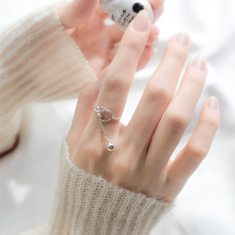 小猫铃铛戒指女S925纯银学生党开口链条小众设计可爱2025新款戒指