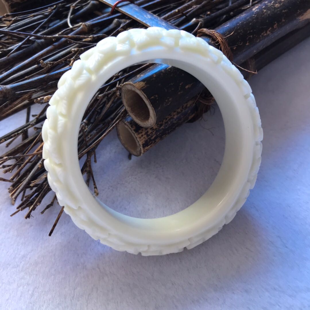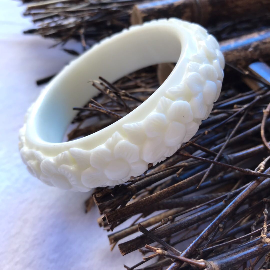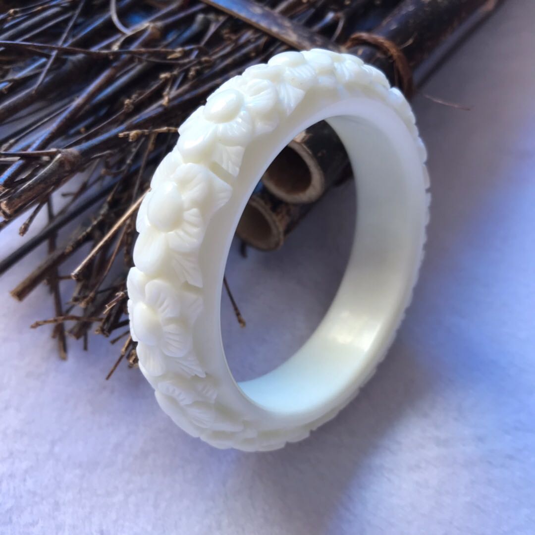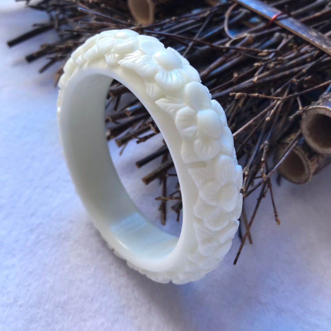 天然岫玉手镯辽宁岫岩玉石骨头白雕花手镯立体雕刻梅花镯子女款镯
