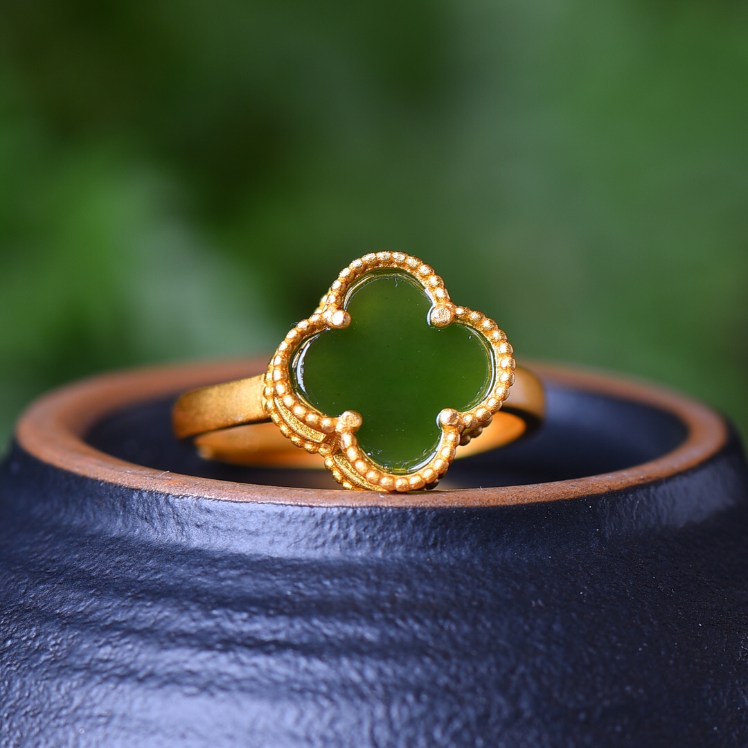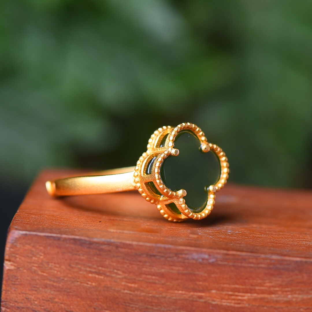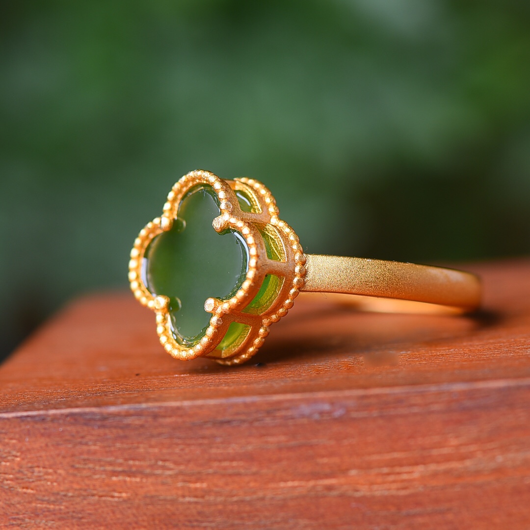 S925银镀18K金镶和田玉碧玉四叶草宫廷复古戒指戒圈汉服配饰指环