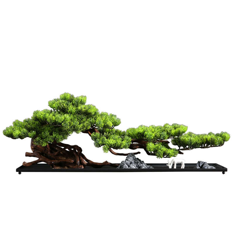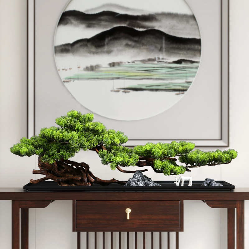 客厅实木仿真迎客松盆景摆件新中式玄关桌面装饰品样板间景观造景