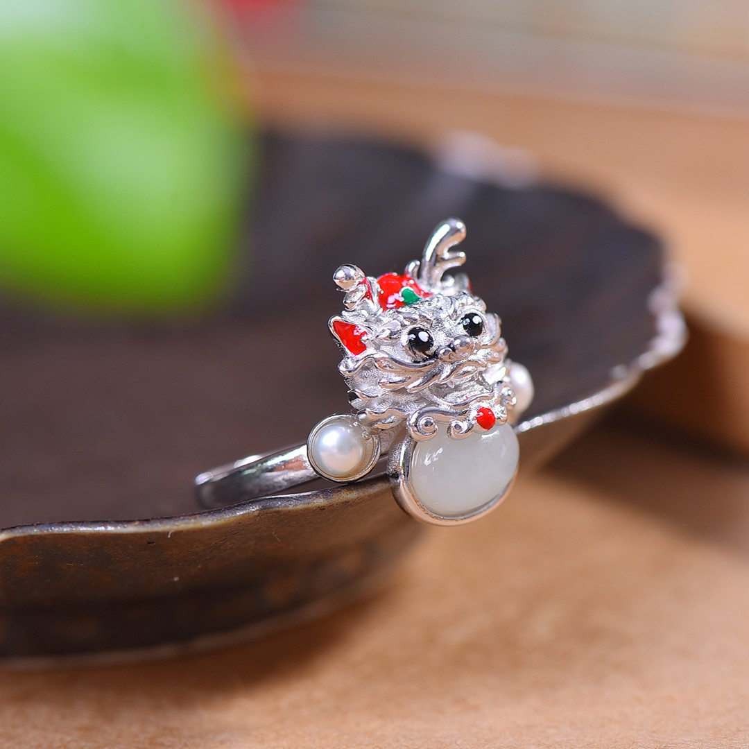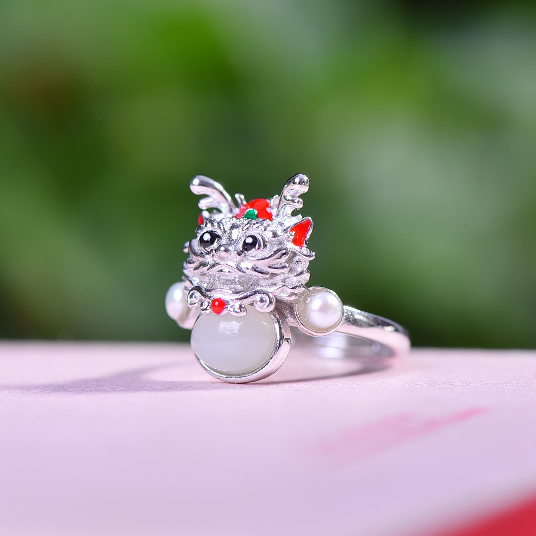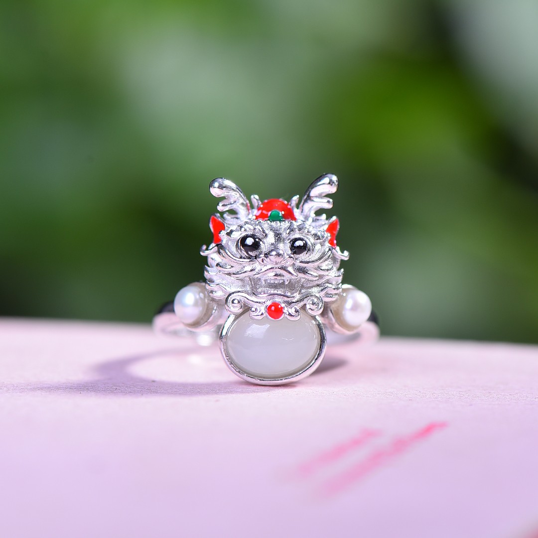 S925银镶嵌和田玉蛋面珐琅配珍珠吉祥龙戒指2025年新款玉石玉戒指