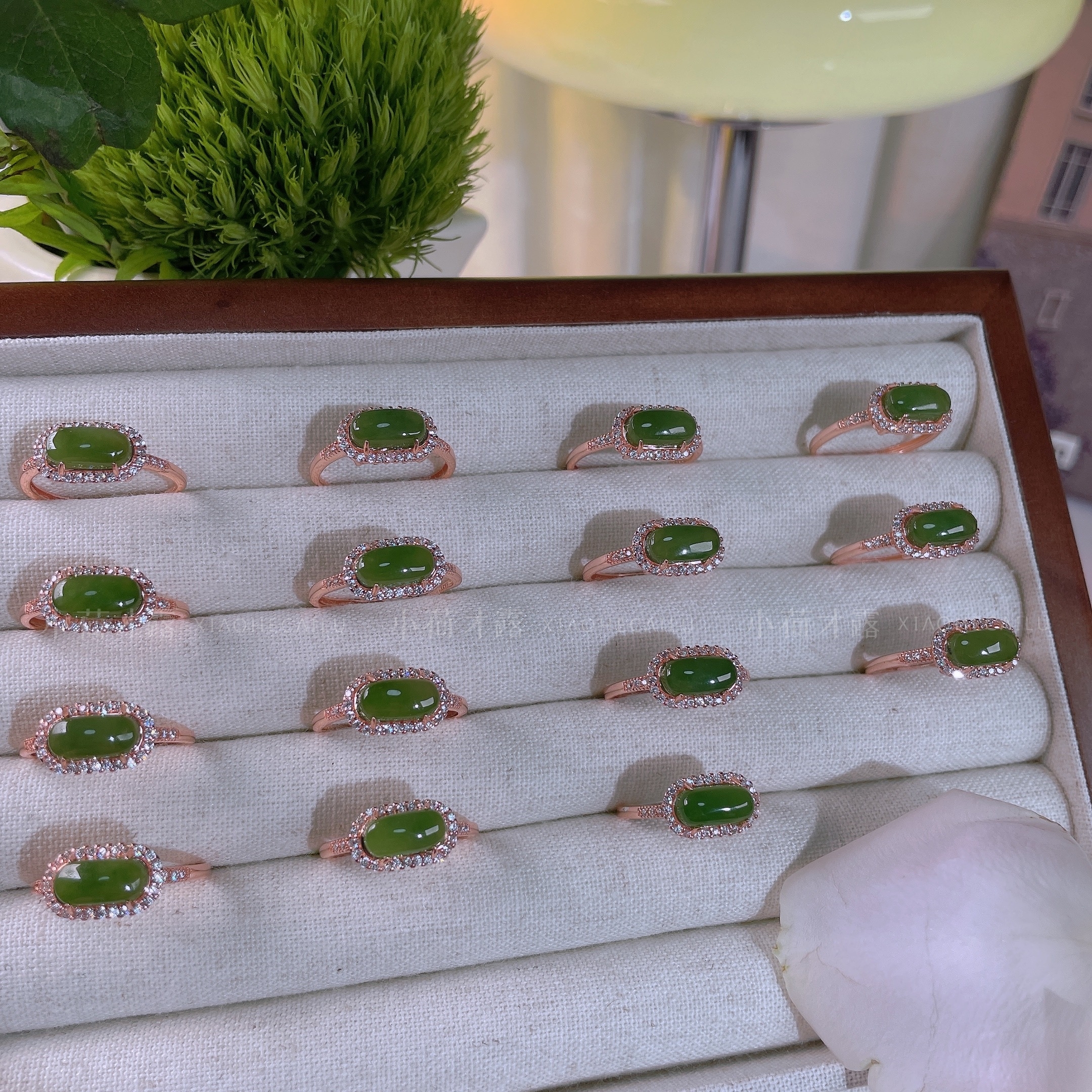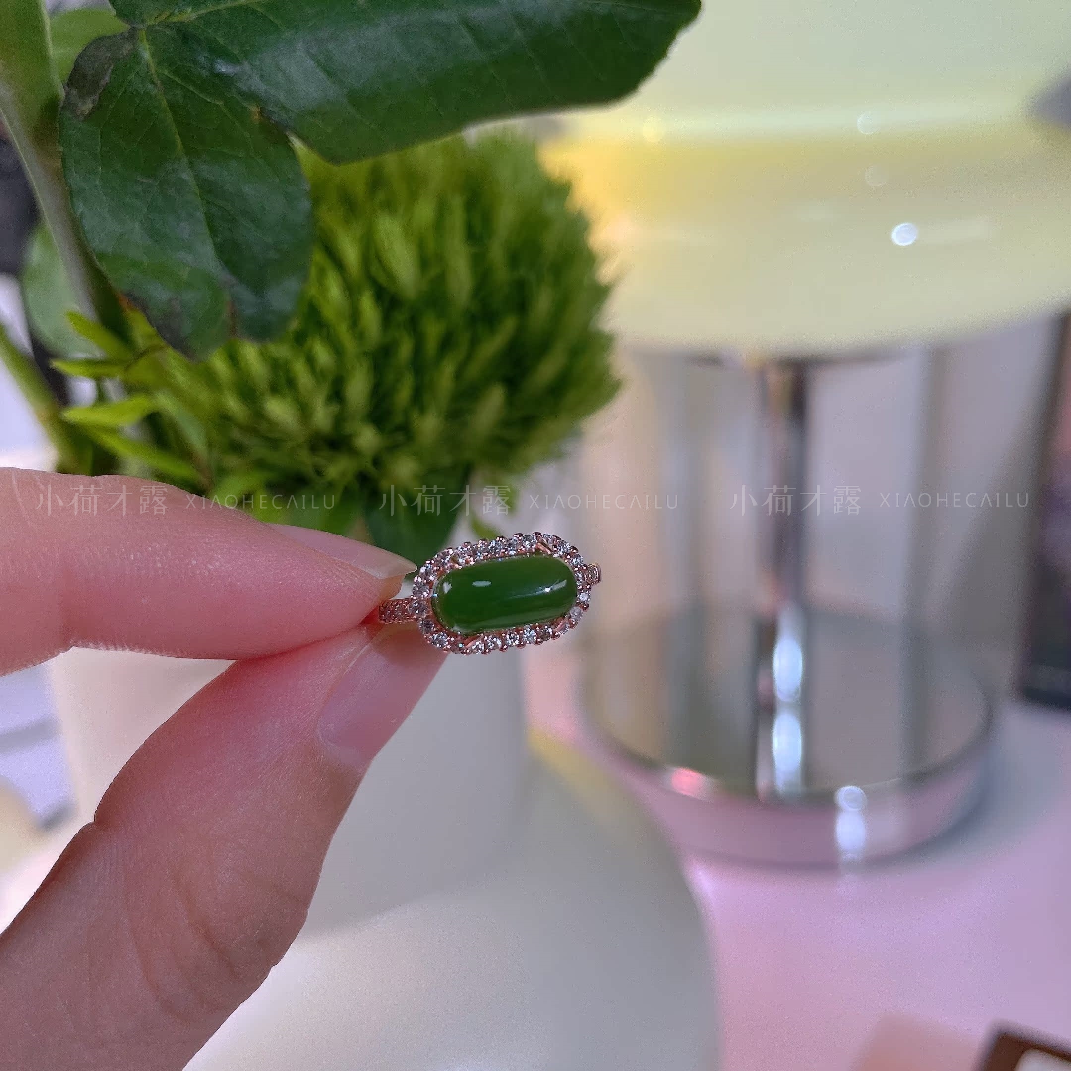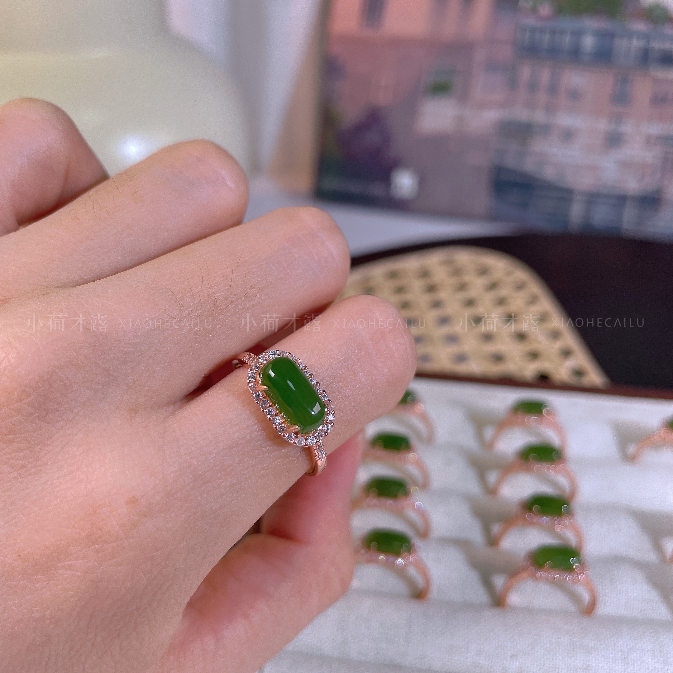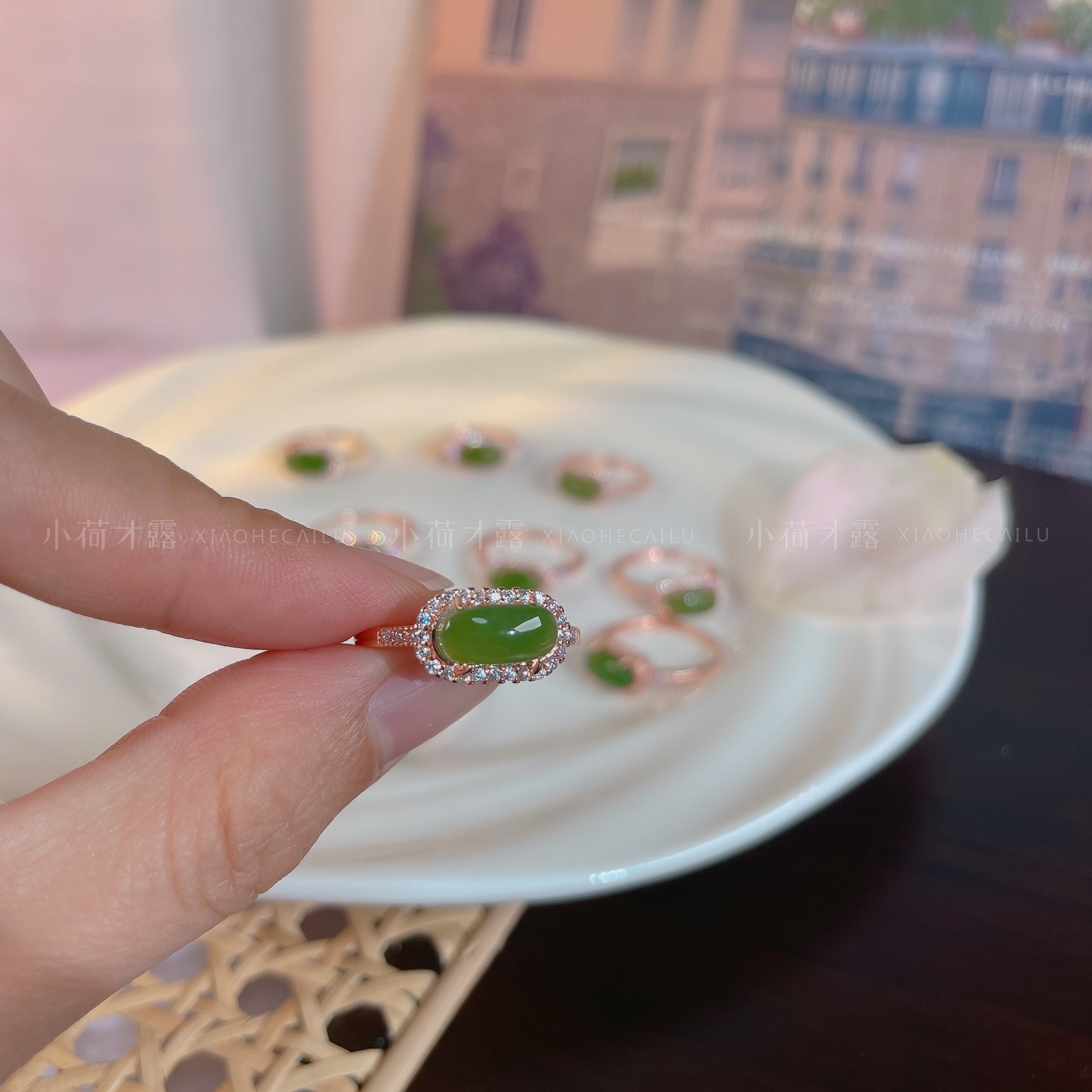 「璀璨」和田玉碧玉马鞍戒指可调节S925银镀瑰金玉戒轻奢镶钻设计