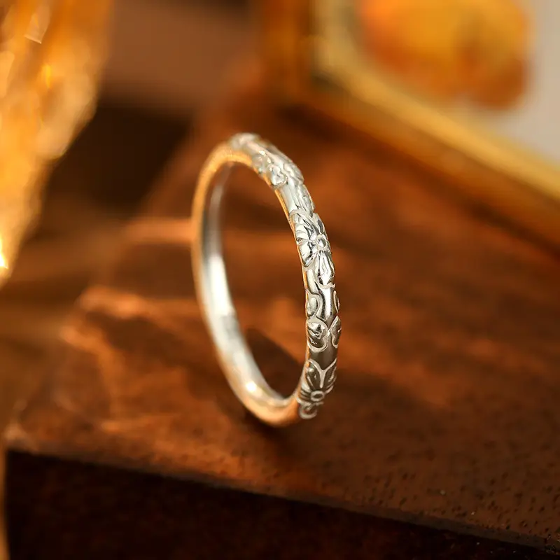 s999银古法浮雕戒指复古素圈足银闭口男女食指环新爆款