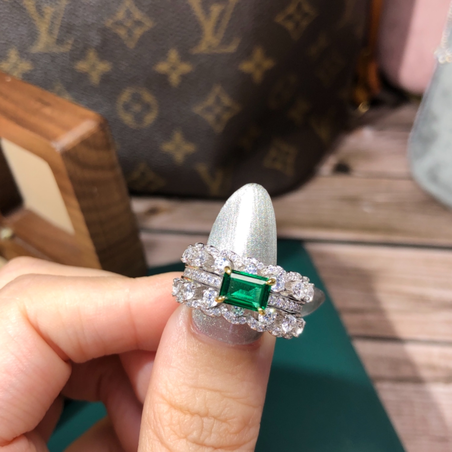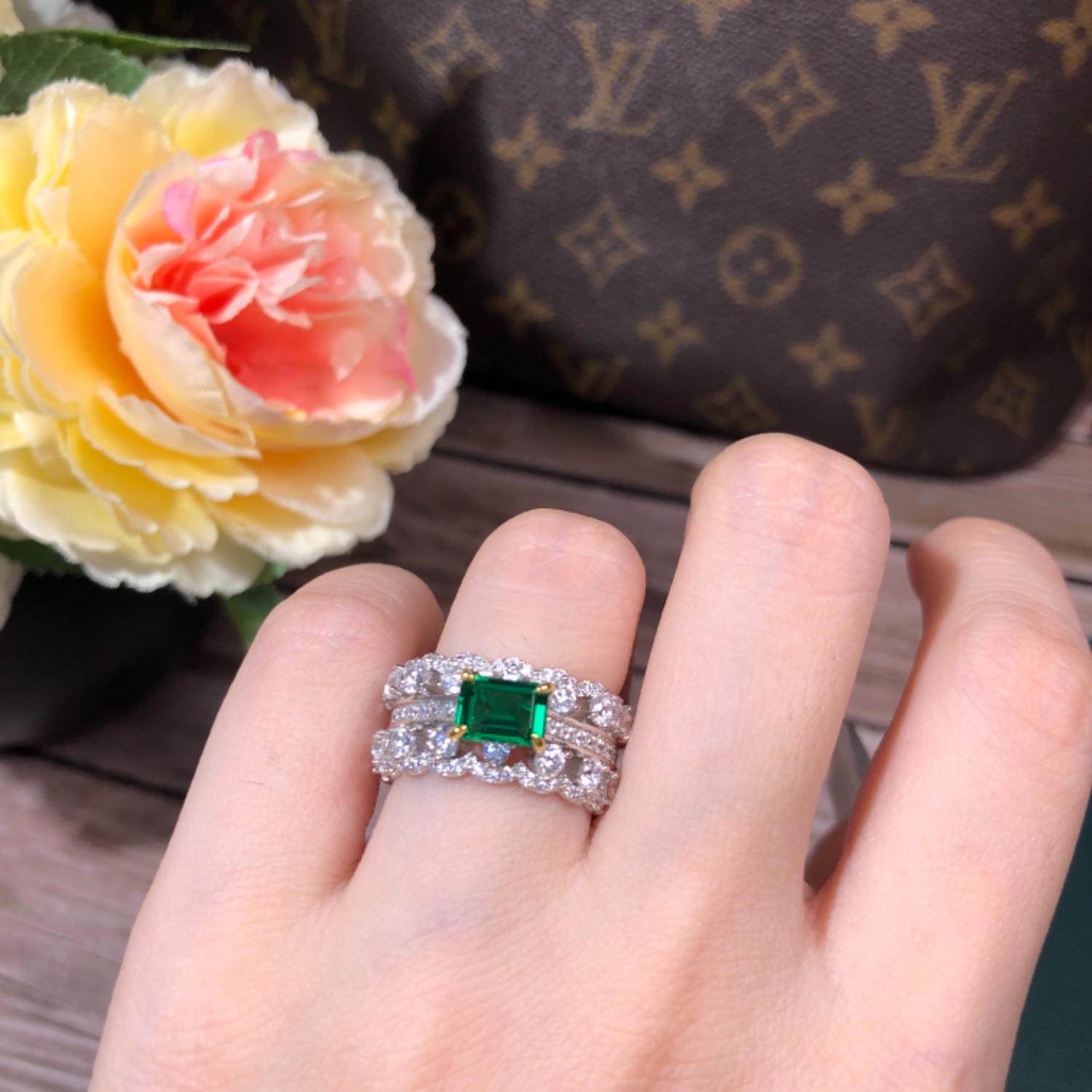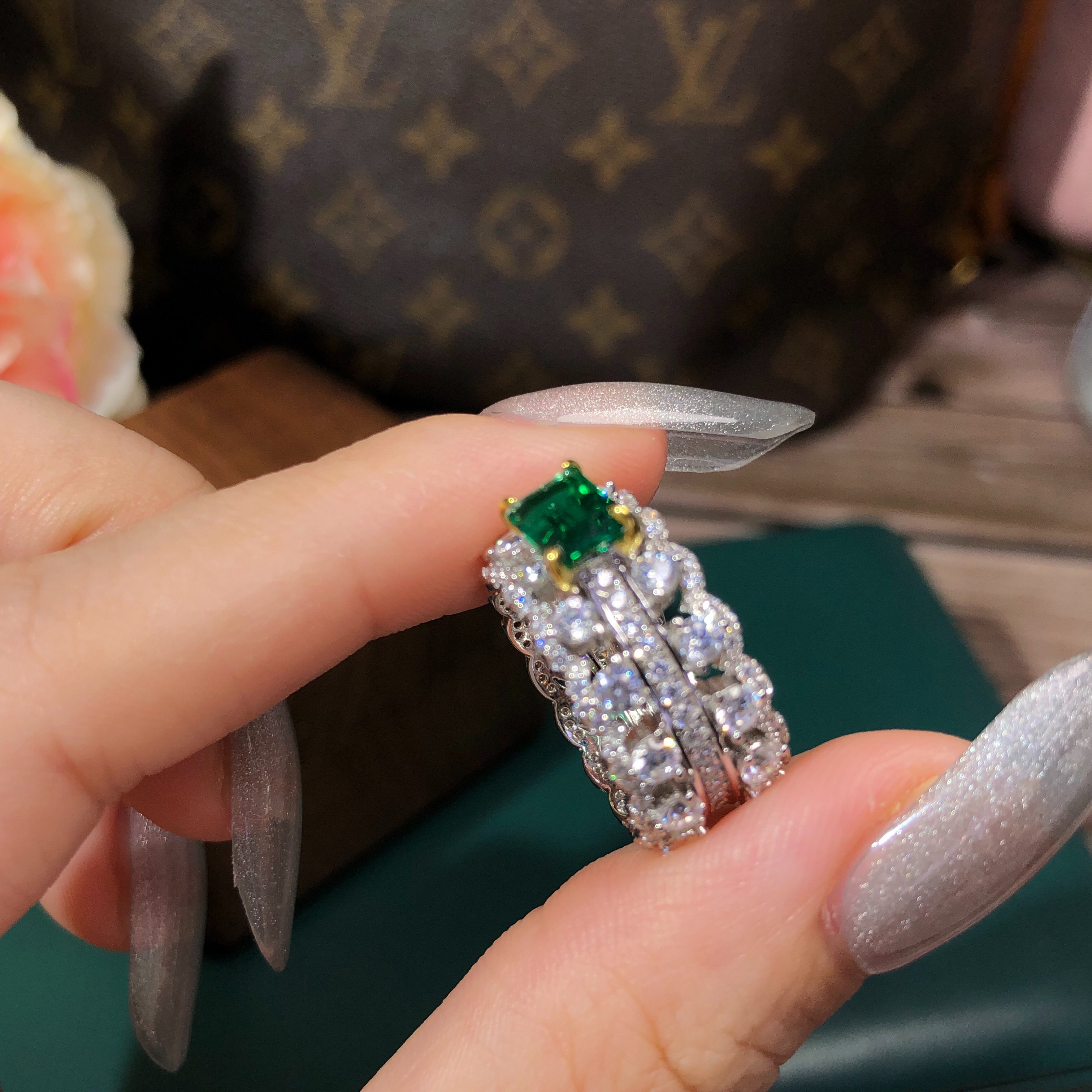 PT950铂金镶嵌进口莫桑钻绿祖母钻戒甜美大气复古风格女指环