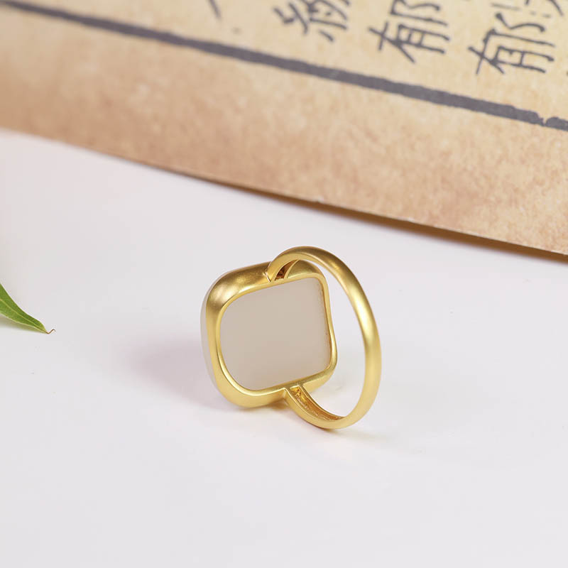 秋季特惠天然和田玉戒指女藕粉白玉方形镶18k金指环a货送老婆生日