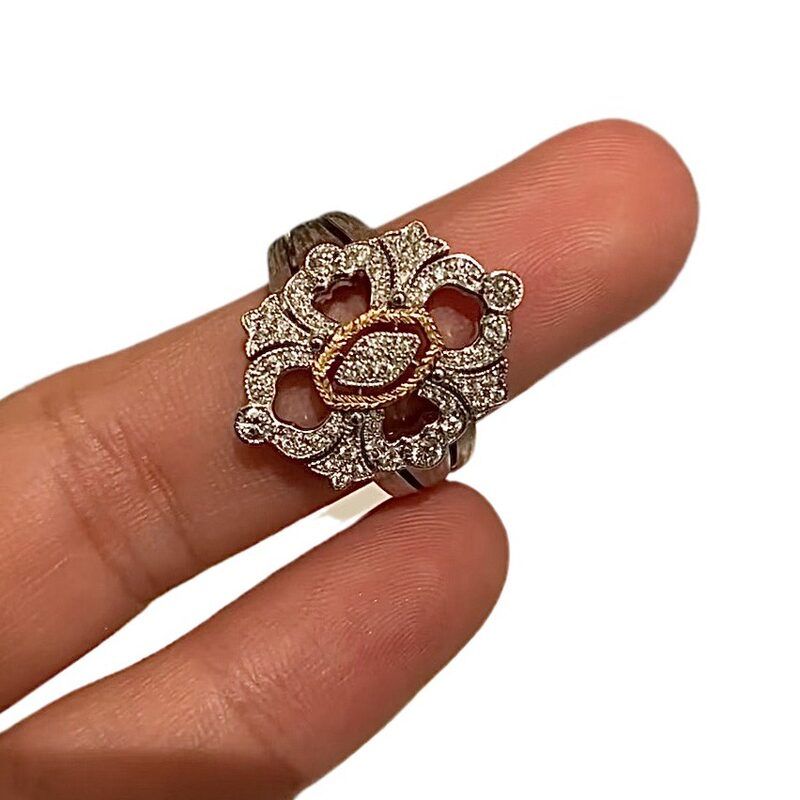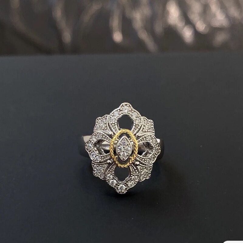 XBK布契风蕾丝银色中古白金戒指法式精致欧美镂空镶钻双色高级感