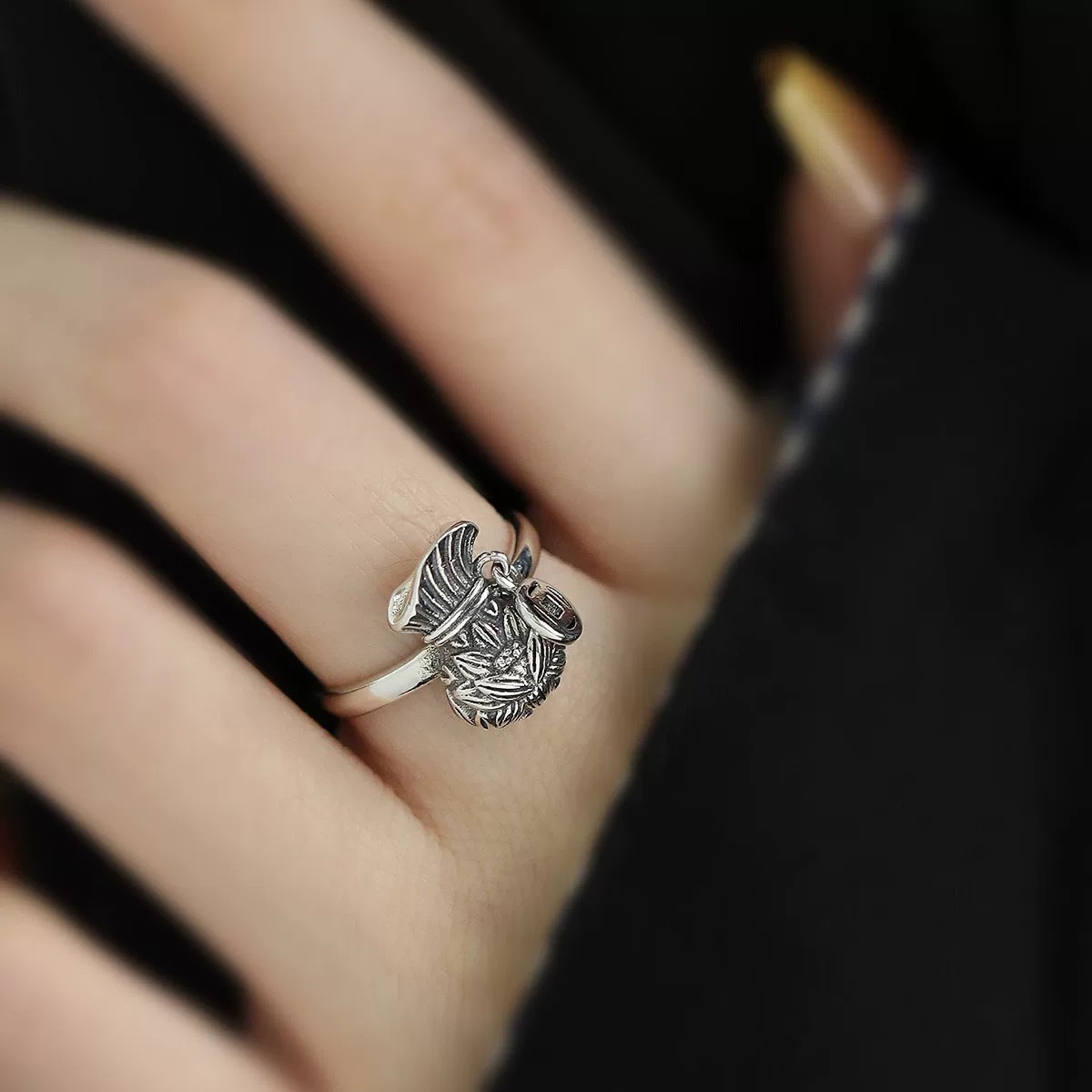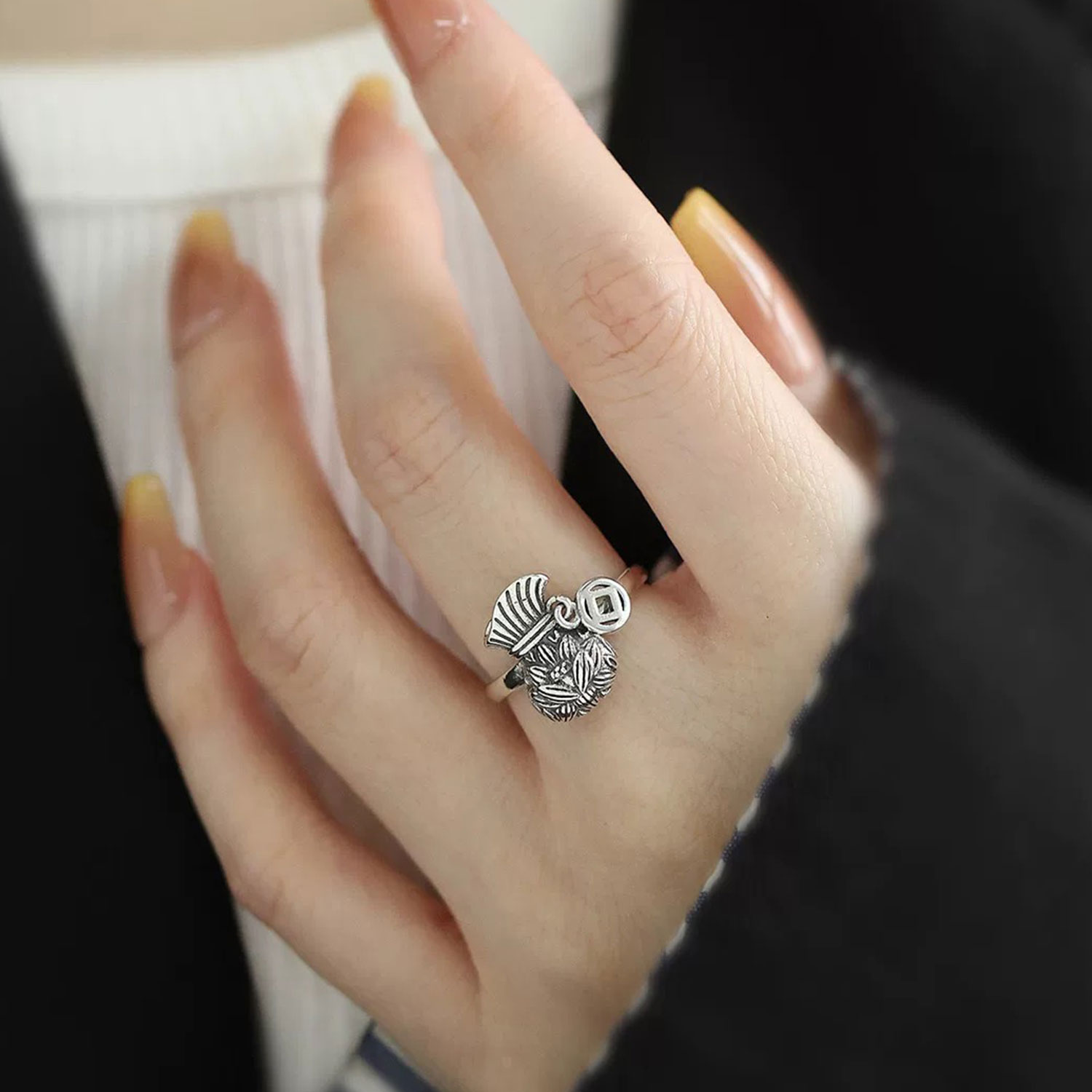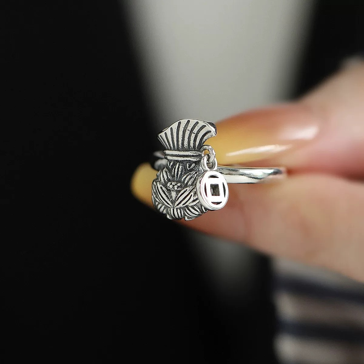 复古925银福袋戒指女新中式民族风做旧开口可调节小众钱币食指戒