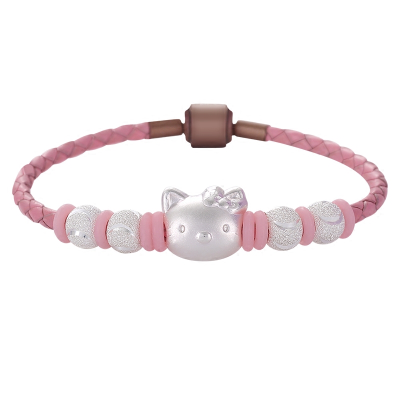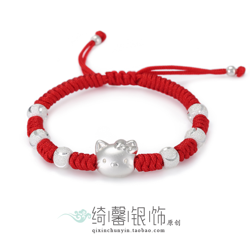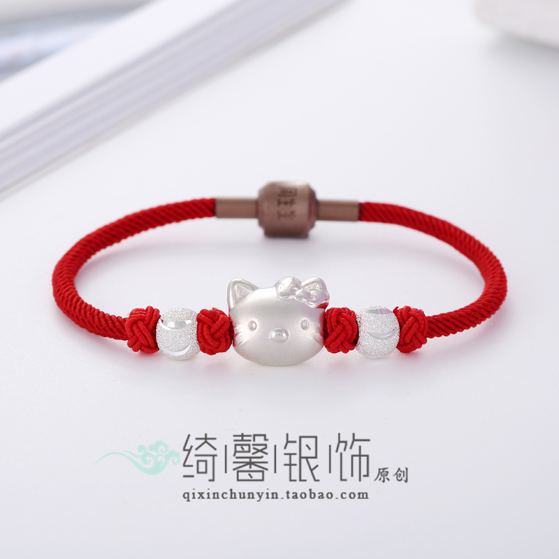 纯银S999hellokitty凯蒂猫儿童手链银红绳皮绳女宝宝生日情人礼物