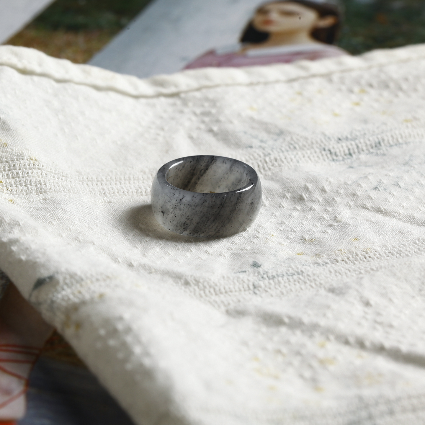 12号戒指 新疆和田玉青花籽料 籽玉宽条圆弧素圈指环 1778