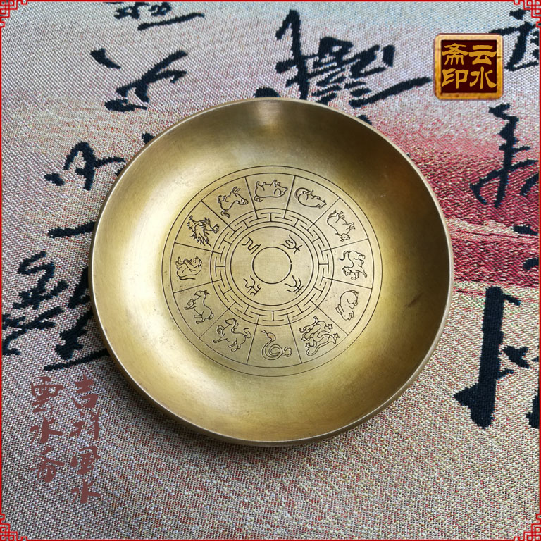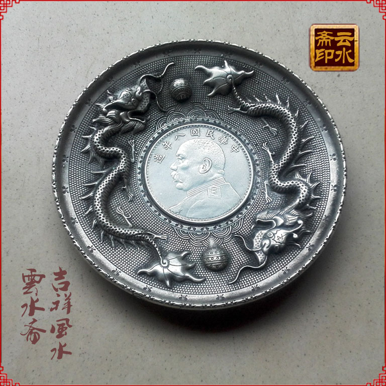古玩杂项收藏 白铜镀银碟子 十二生肖龙银元盘子 博古摆件 笔架
