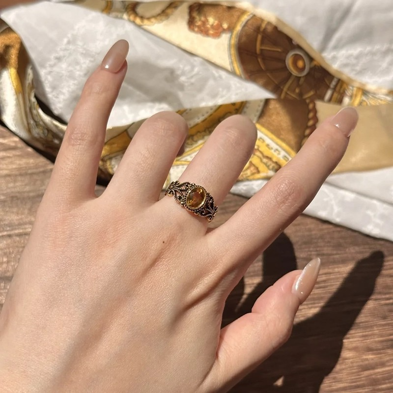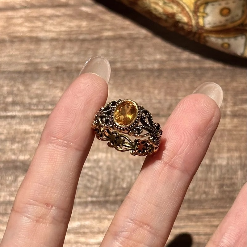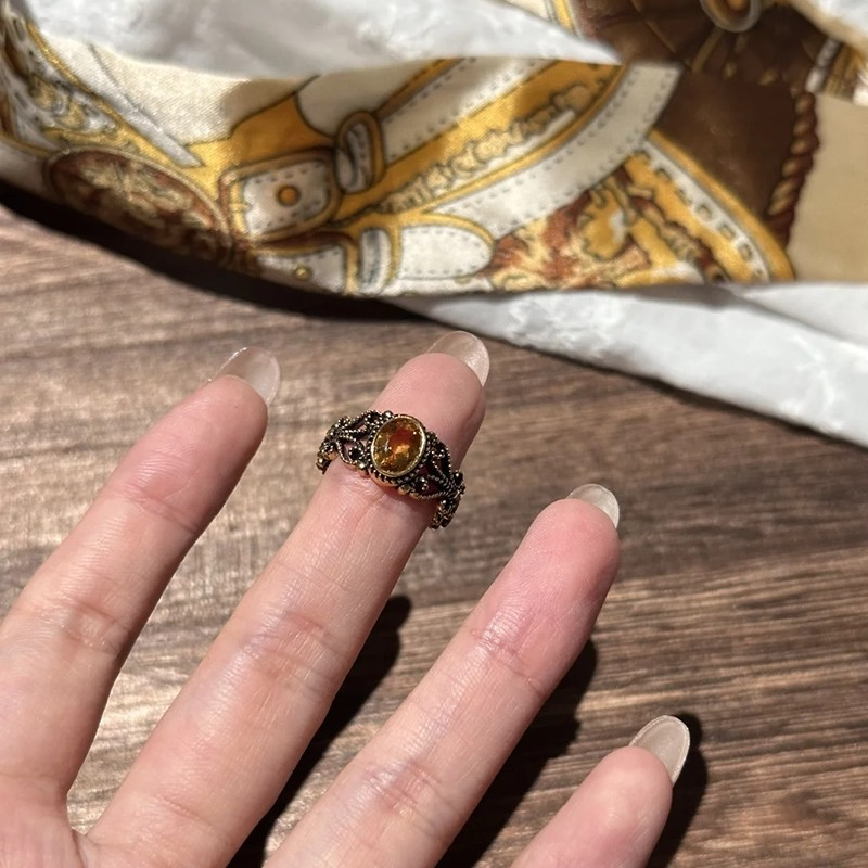 2025年新中式复古轻奢新黑金色仿碧玺黄钻戒指高级感镂空花丝指环