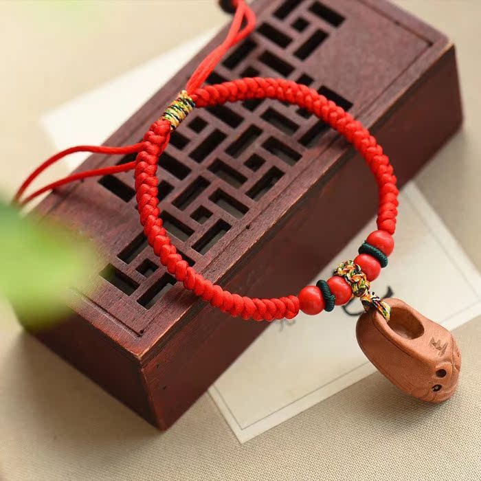手工精雕桃核小鞋手链 红绳编织桃核手链 桃核鞋手串