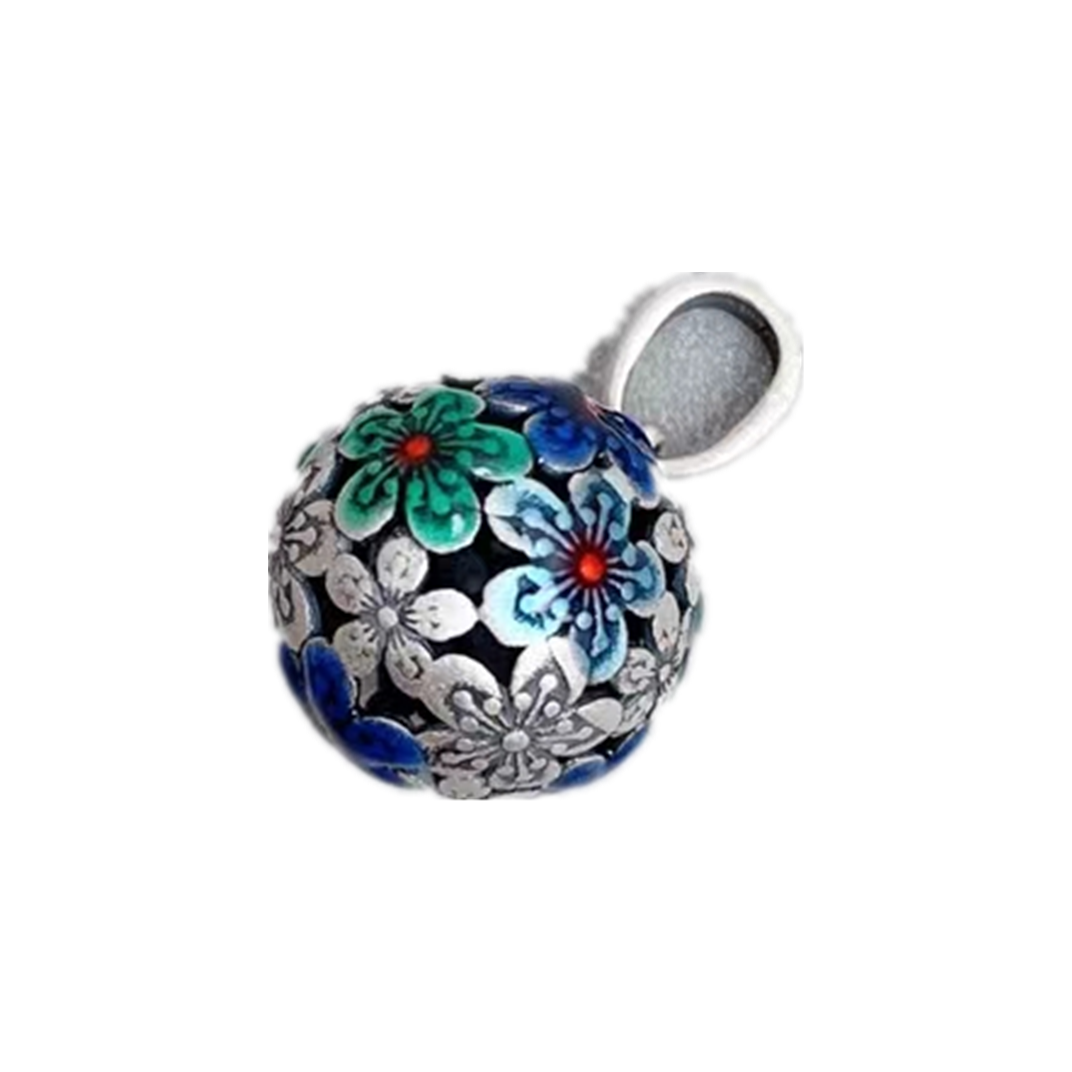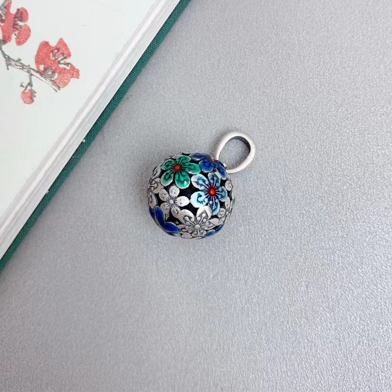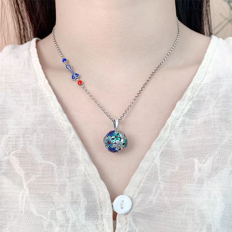 S925银圆形景泰蓝花绣球项链女锁骨链国风吊坠饰品