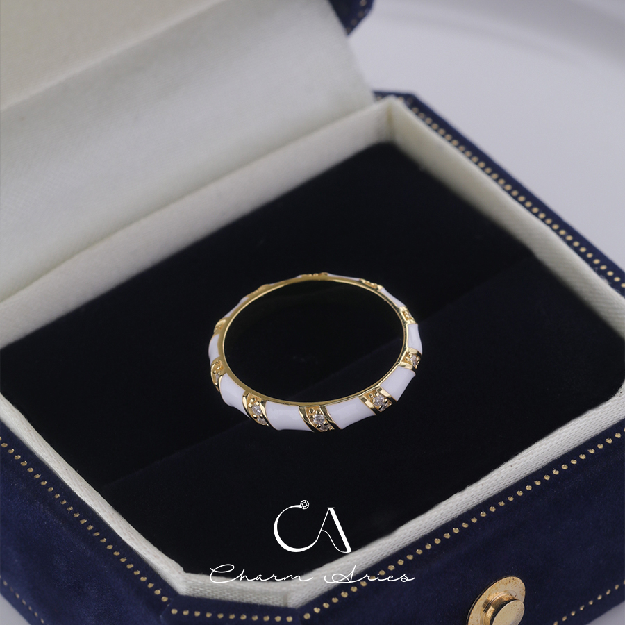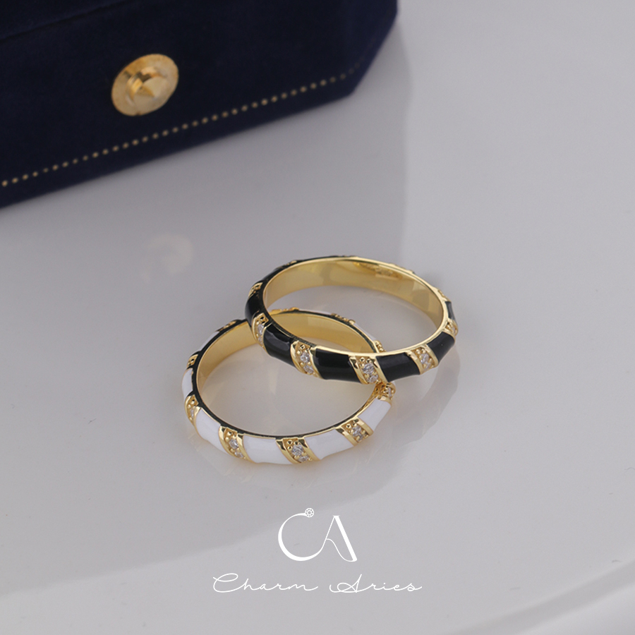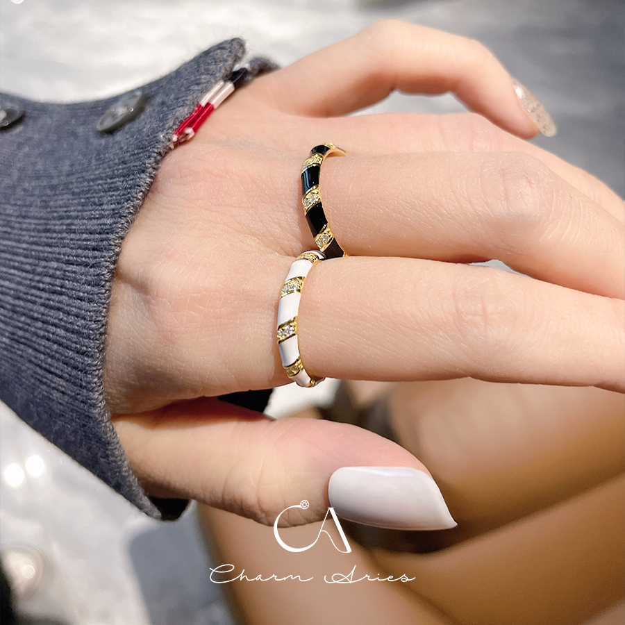 S925纯银镀金黑白珐琅条纹轻奢戒指高级感中古风闭口叠戴钻戒礼物