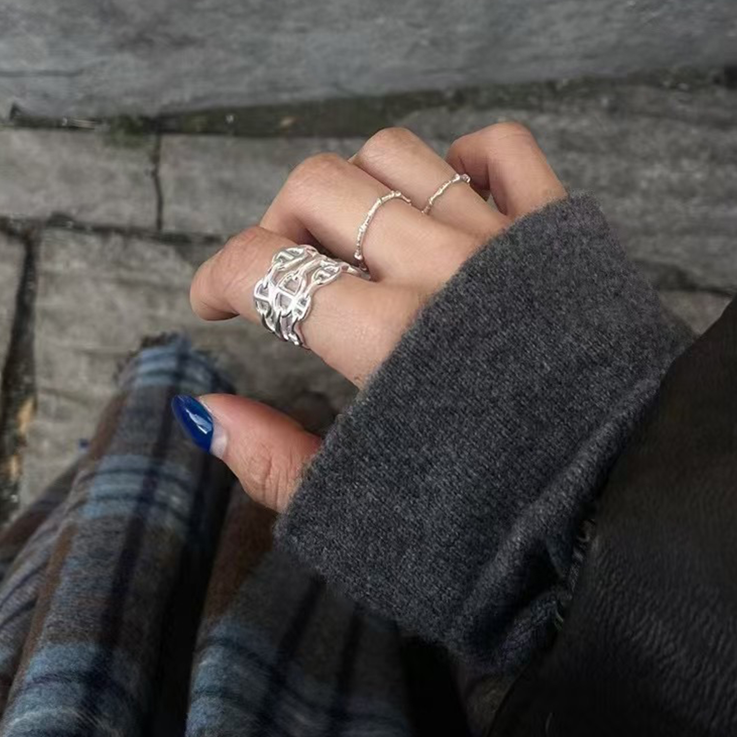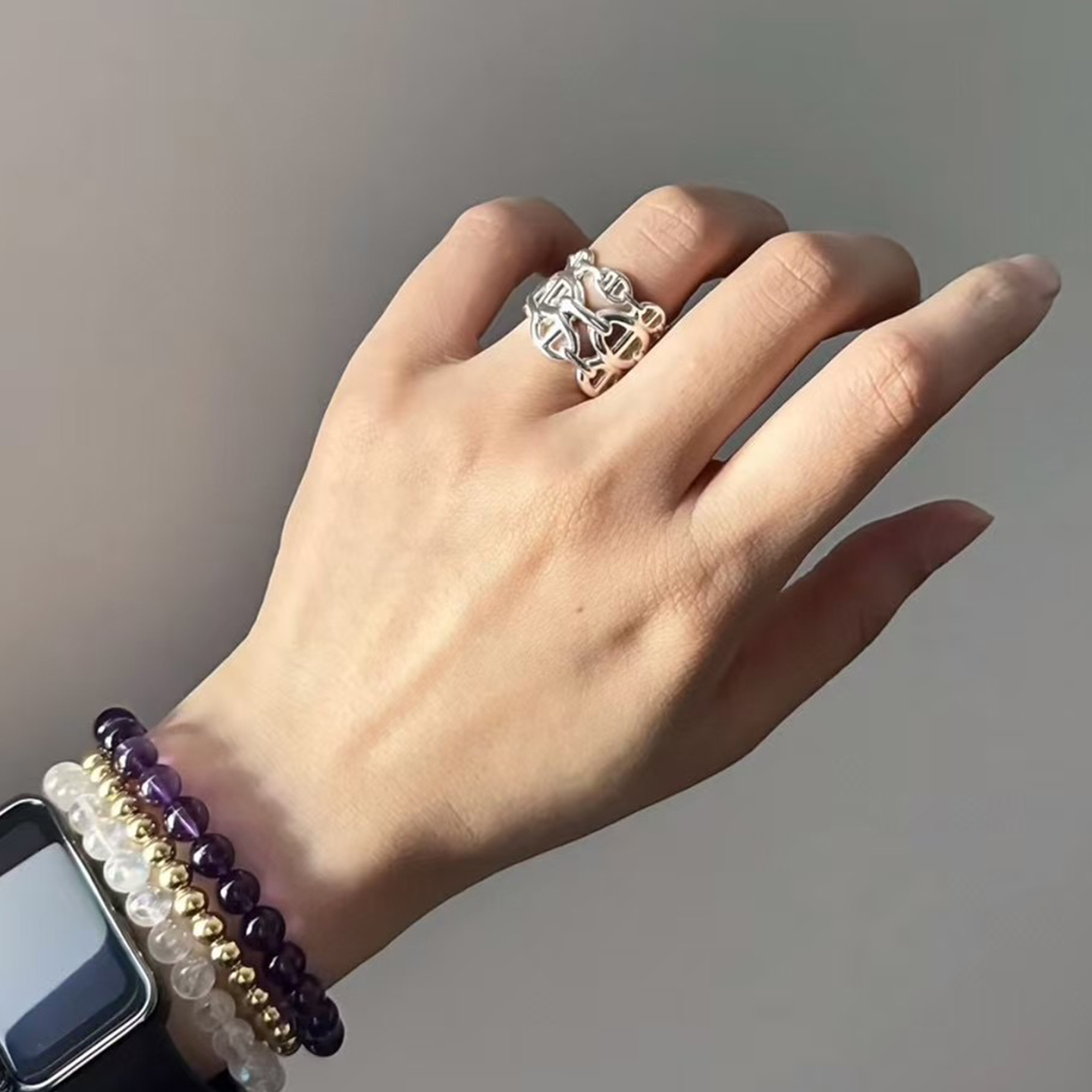 非市场货!经典三圈猪鼻子开口戒指女士时髦三层链条指环 925纯银