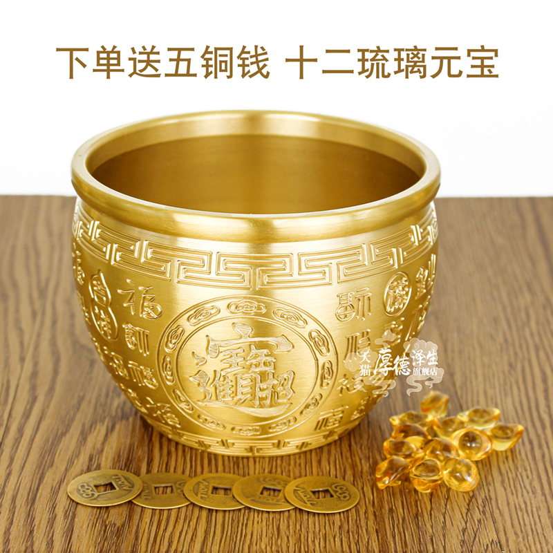 铜百福铜缸纯黄铜米缸聚宝盆摆件客厅办公小铜盆存钱罐