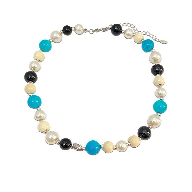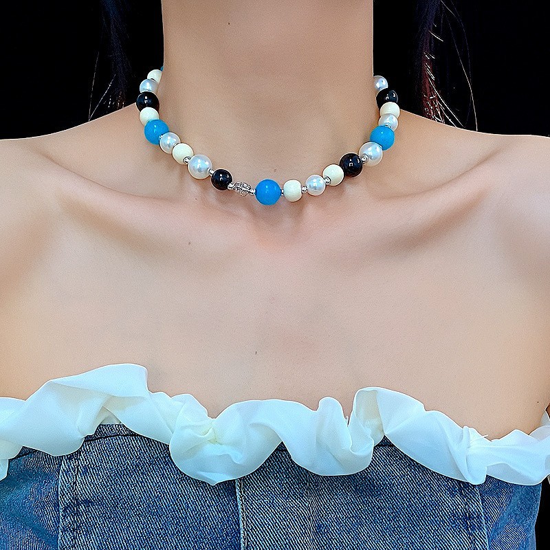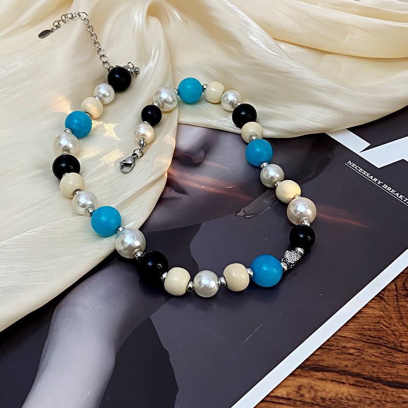 珍珠拼色玻璃串珠项链法式复古高级感锁骨链气质百搭时尚饰品批发