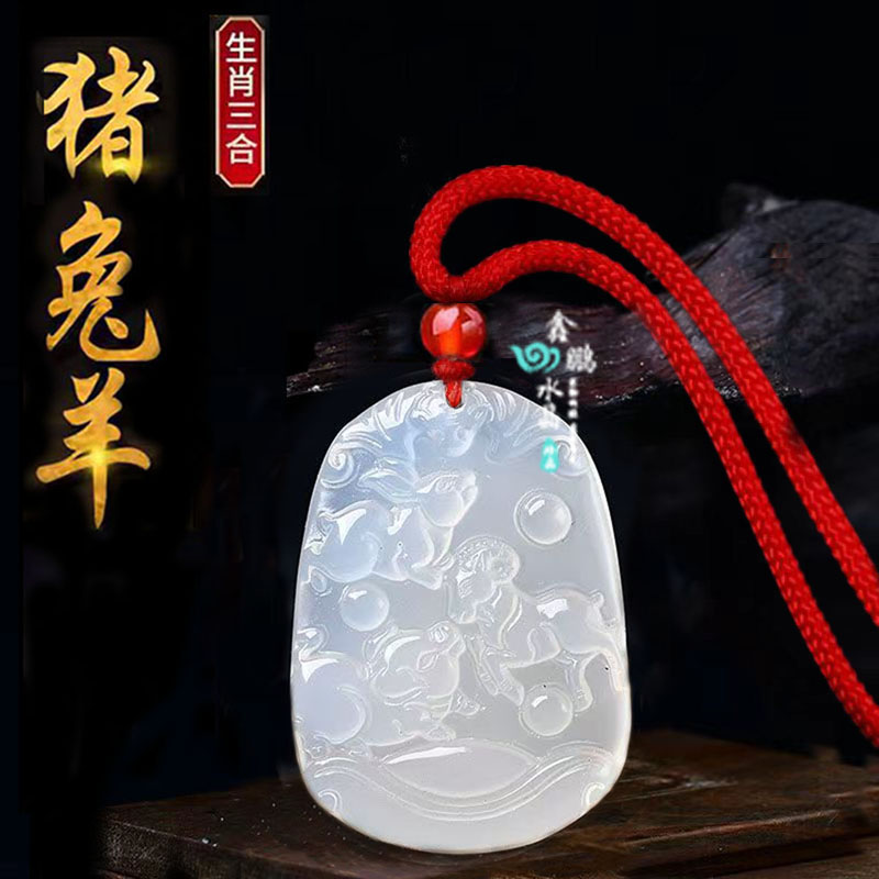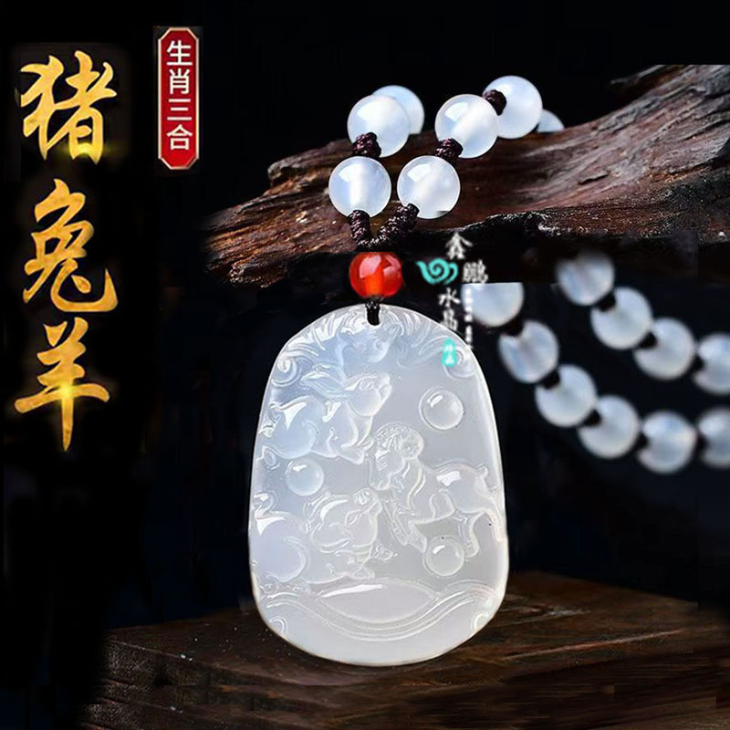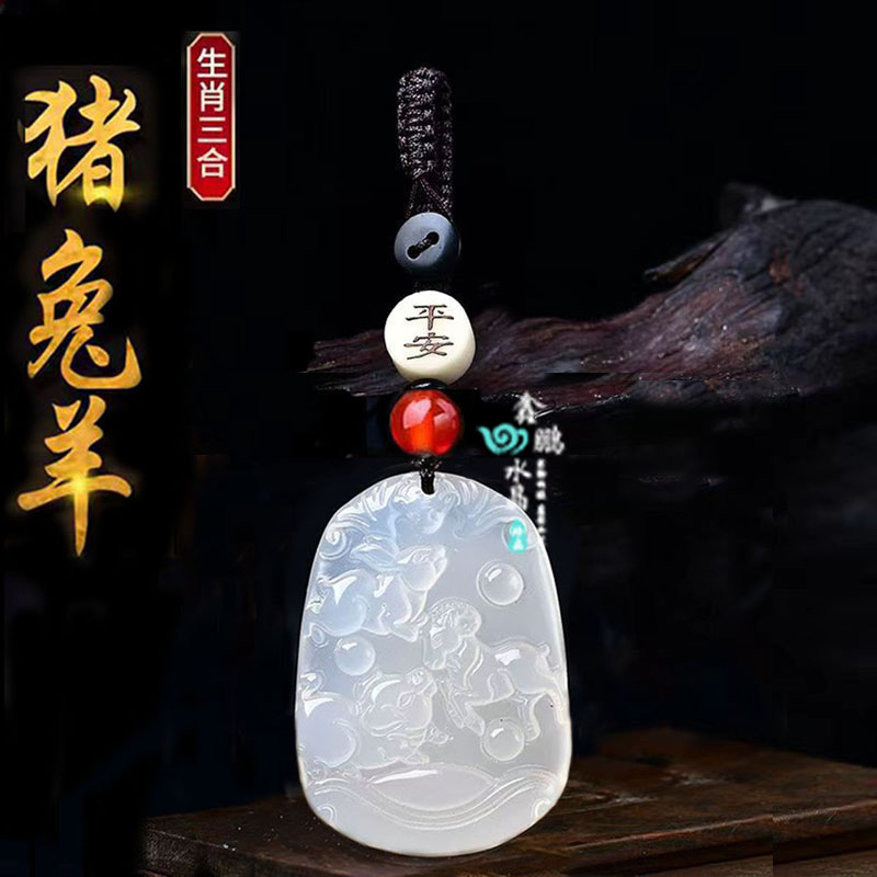 2025年天然白玛瑙生肖猪兔羊三合贵人项坠男女招财运转车挂钥匙扣