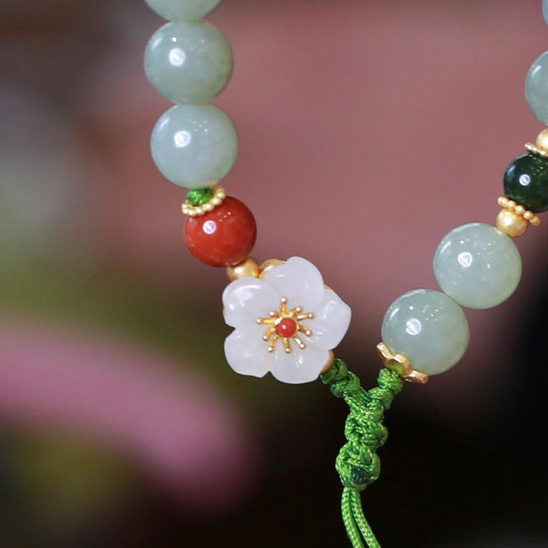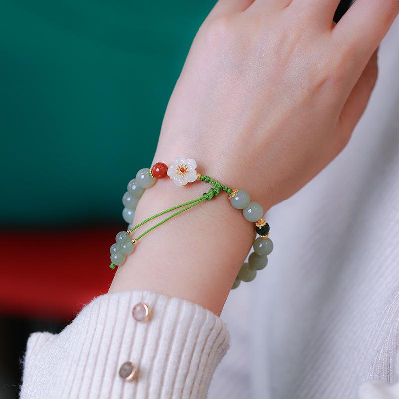 8MM圆珠和田玉双流苏手链 春色满园桃花朵朵开设计款手工编织手串