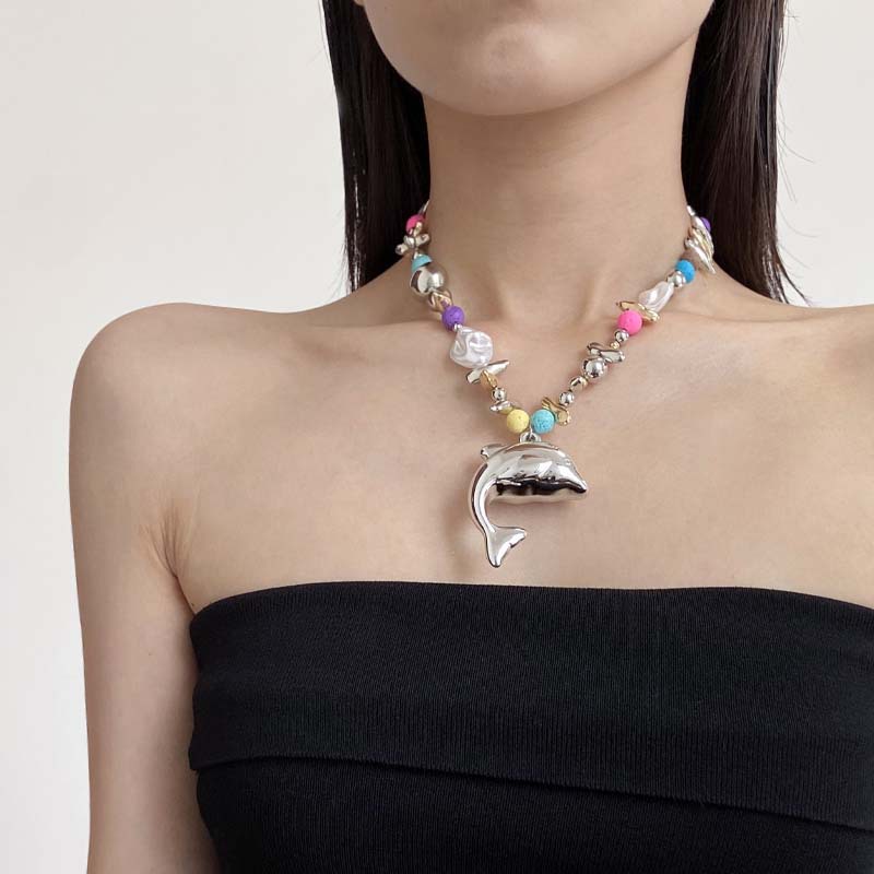 甜酷辣妹不规则彩色串珠海豚吊坠锁骨链女轻奢高级感多巴胺颈项链