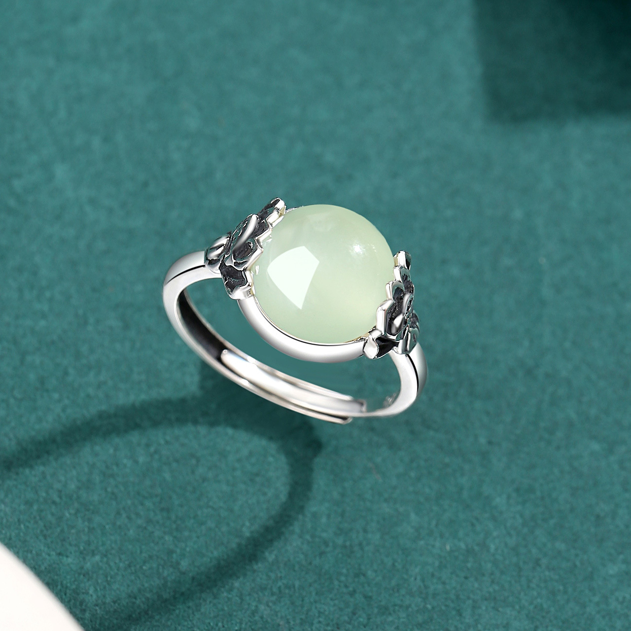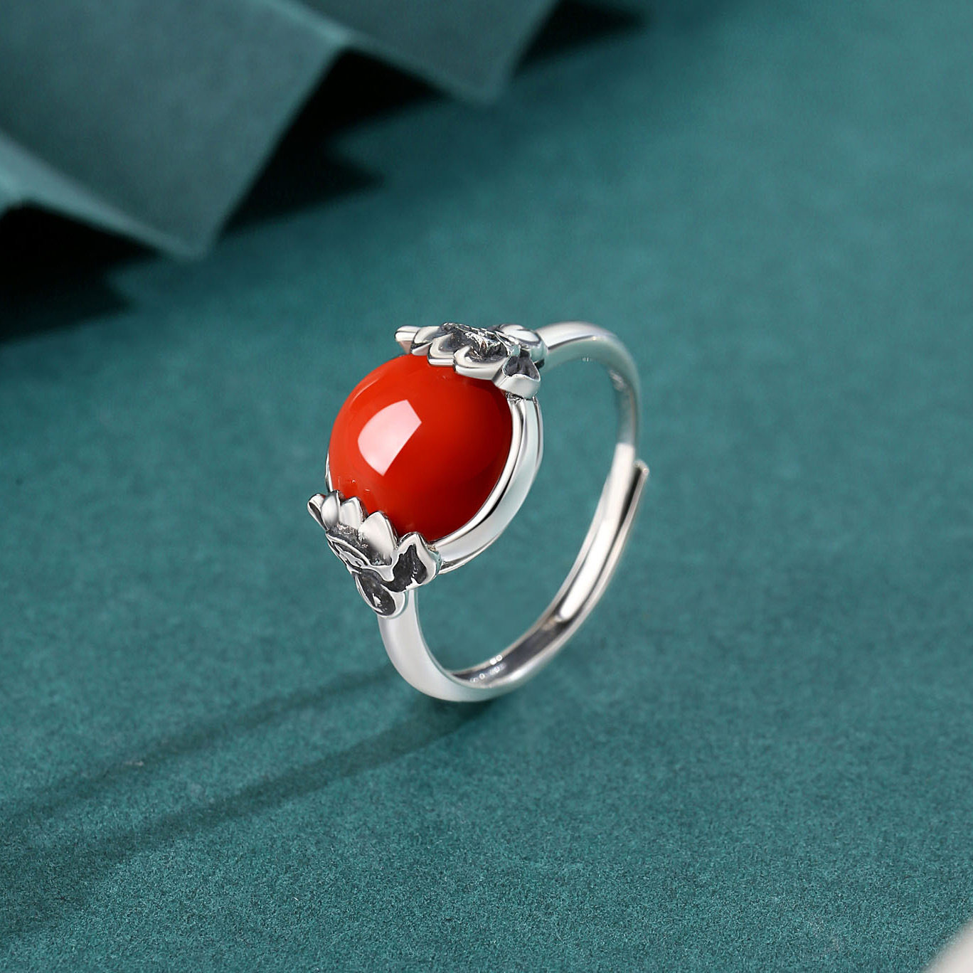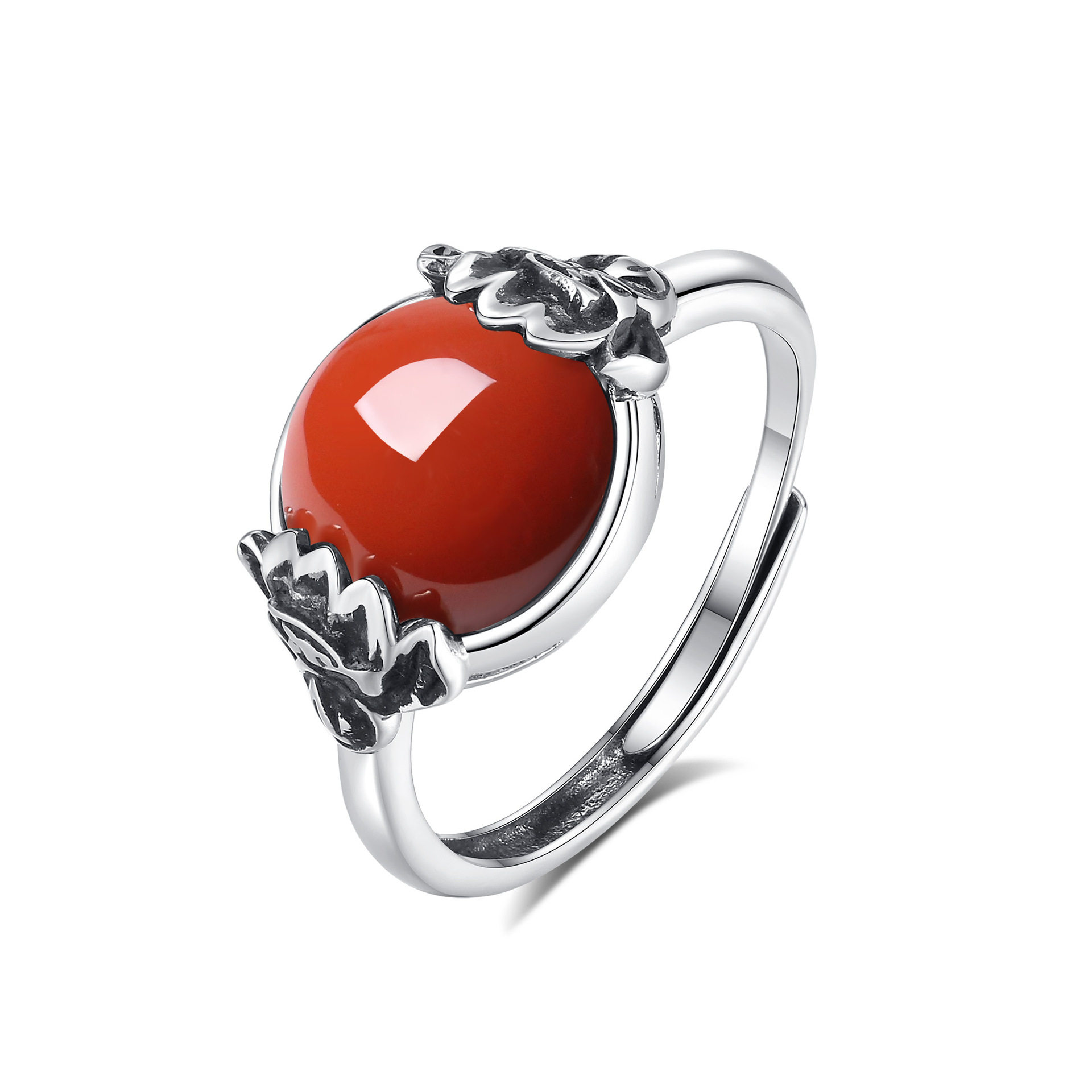 轻奢高级感S925纯银莲花南红玛瑙和田玉戒指女复古做旧百搭食指戒