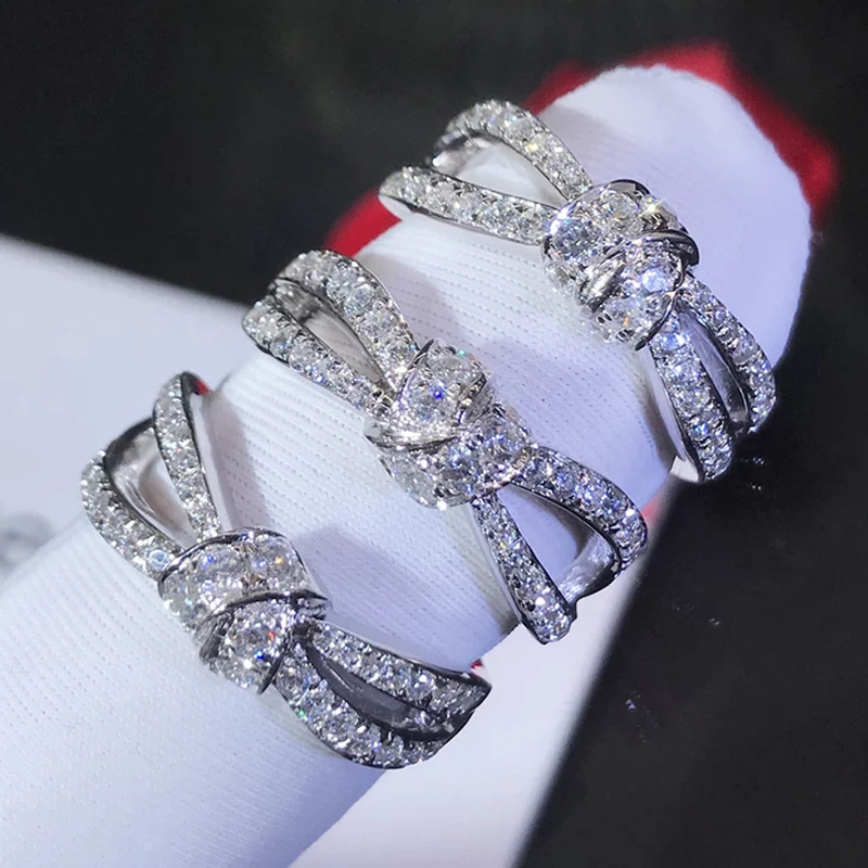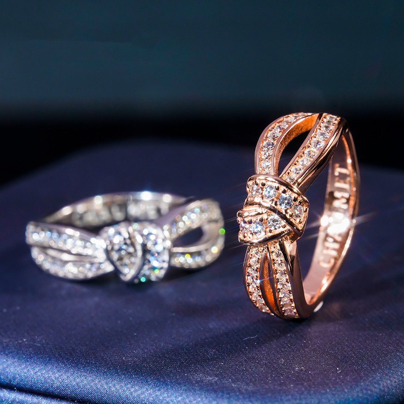 18K玫瑰金群镶莫桑石蝴蝶结缘戒指优雅百搭纯银指环铂金日常通勤