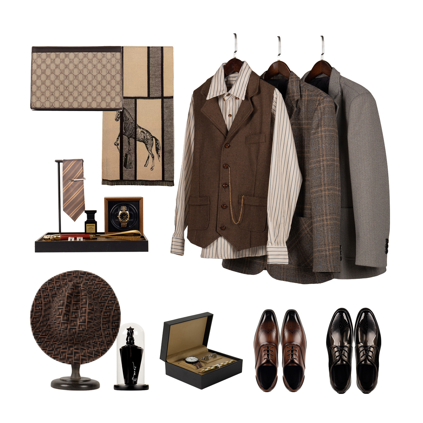 新款男士衣柜样板房衣帽间老钱风复古礼帽香水皮鞋包粗布托盘软装
