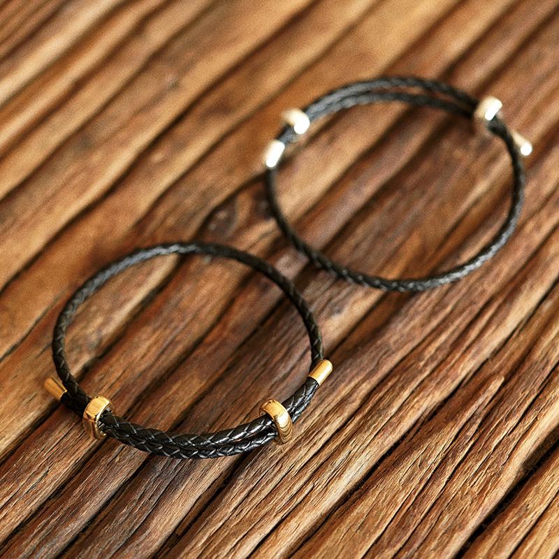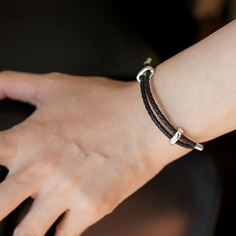 山仓 真皮绳可调节手链牛皮手环男女情侣编制皮手绳中性简约黑色