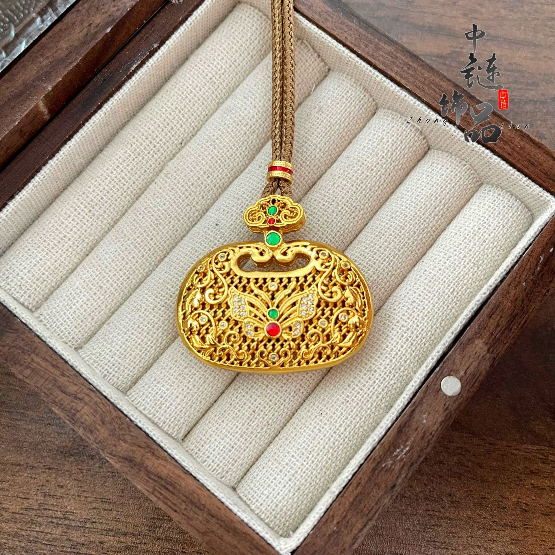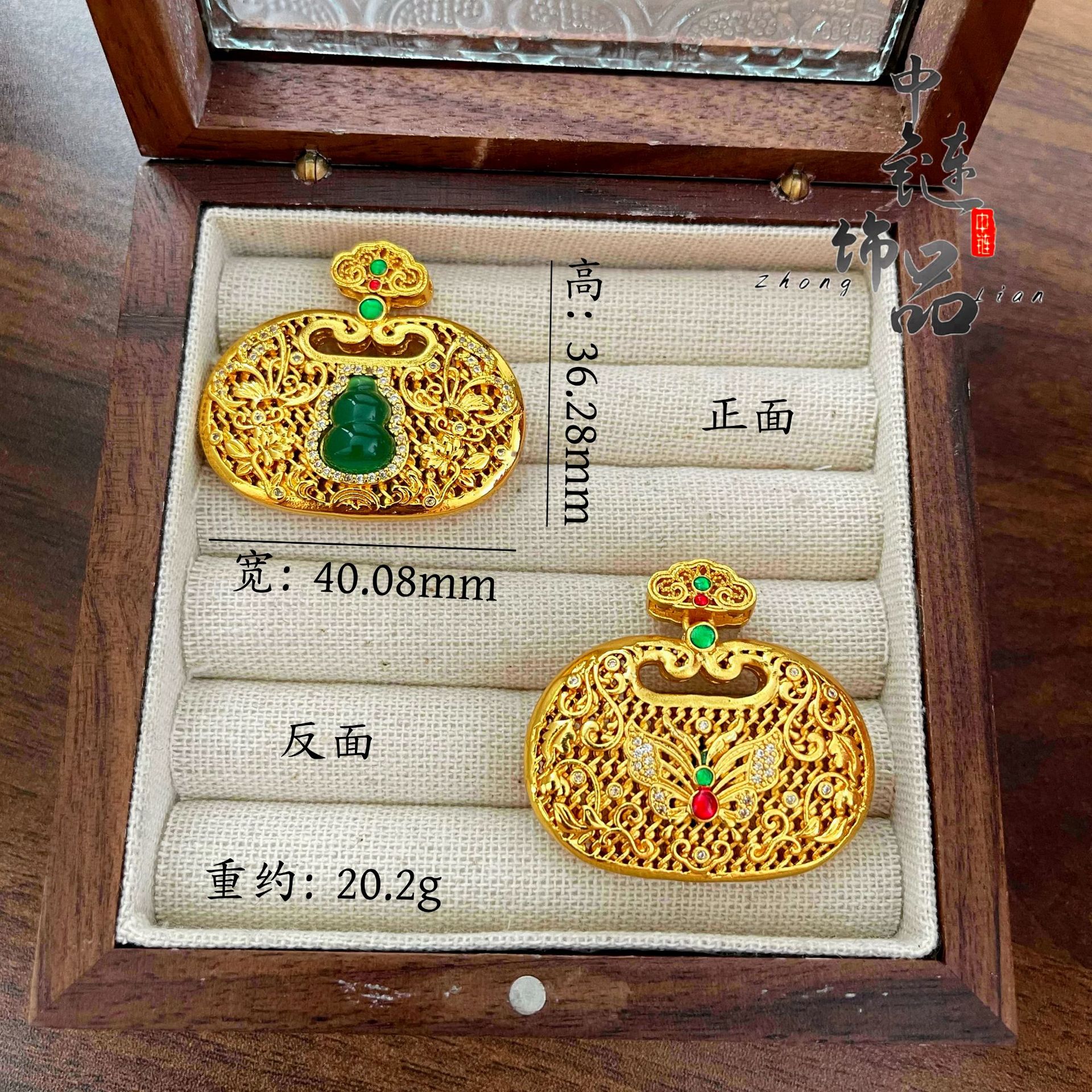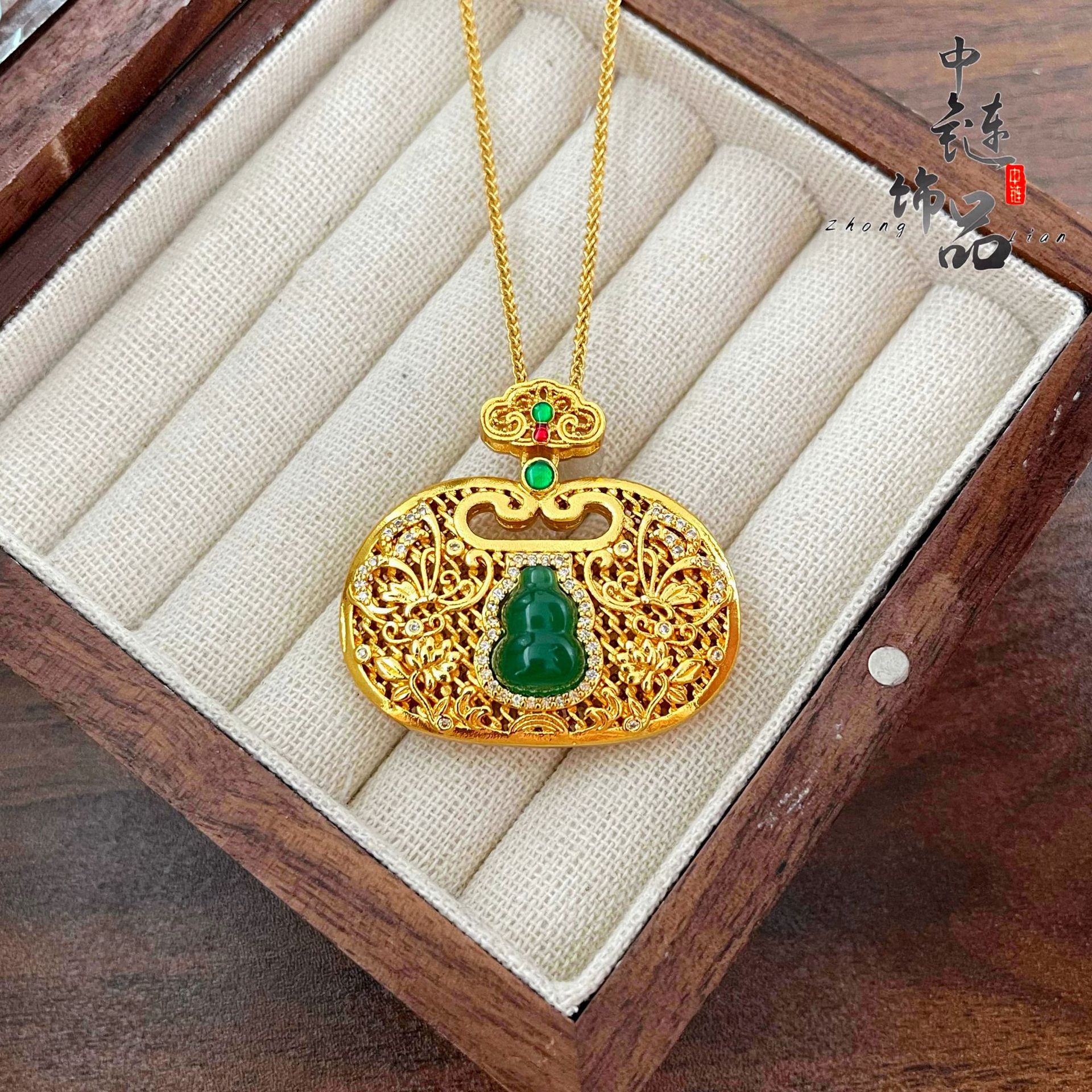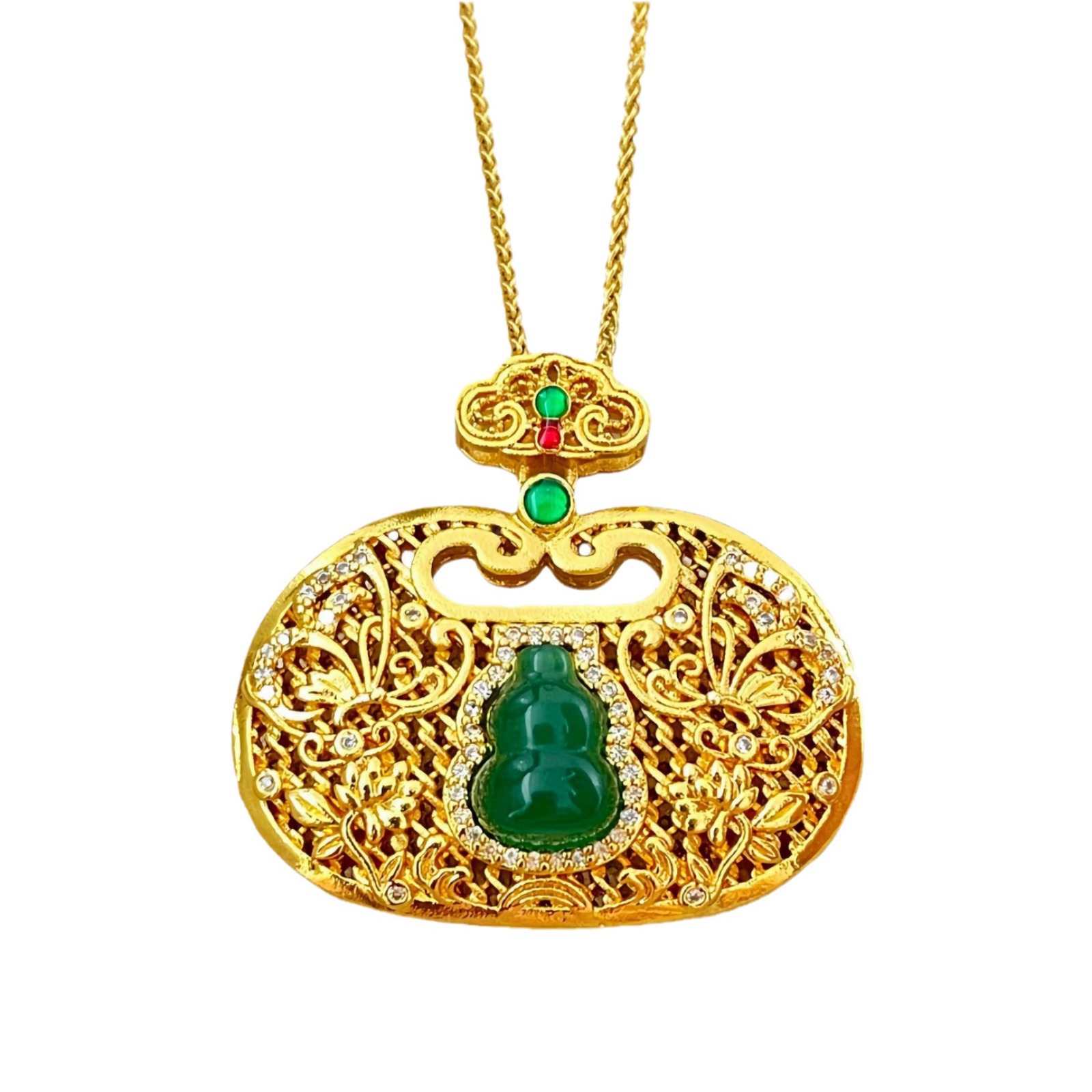 金店同款古法沙金镶钻富贵绿宝葫芦锁包吊坠镂空花丝蝴蝶如意锁包