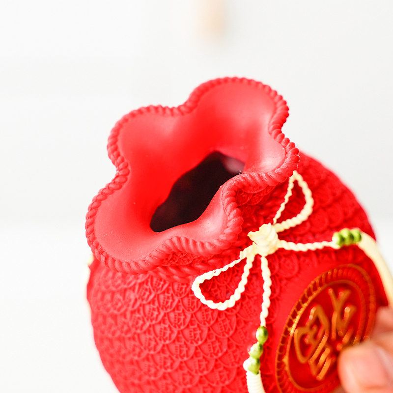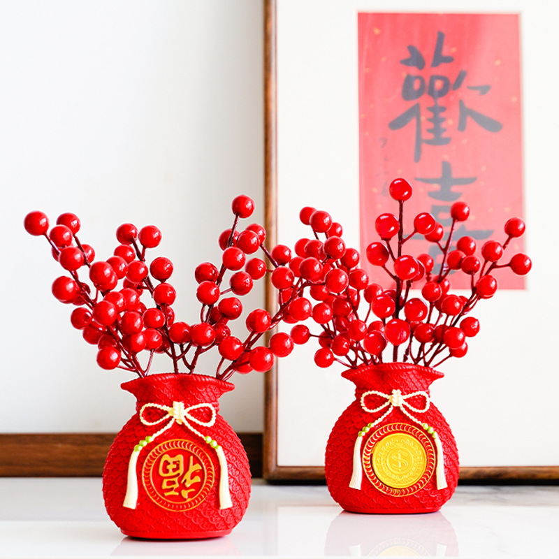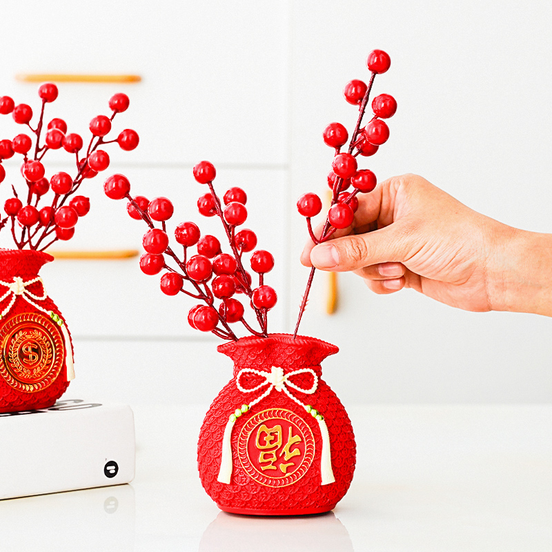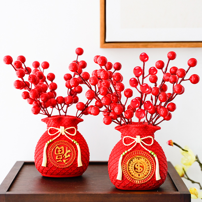中国风家居摆件旺财花瓶福袋红浆果招财钱袋福袋客厅玄关红色摆件