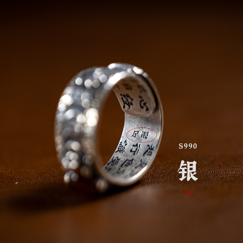 高档纯足银招六字真言心经金蟾戒指男女情侣开口板指环复古礼物财