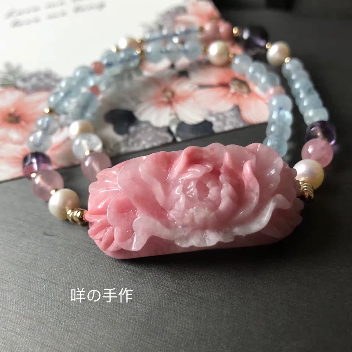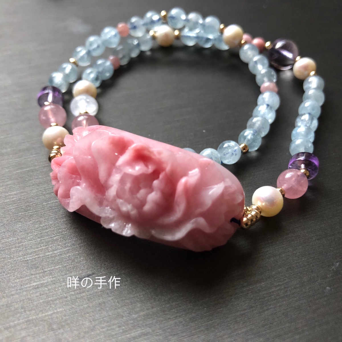 咩の手作精工雕刻冰粉蔷薇辉牡丹花梅花手牌海蓝宝双圈多圈手链