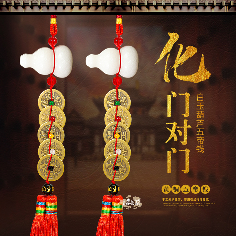 汉白玉葫芦五帝钱挂饰五色珠子门对门红色黄铜铜钱五行.玉髓装饰