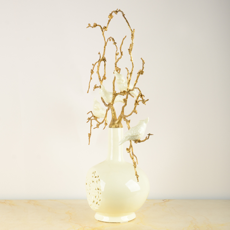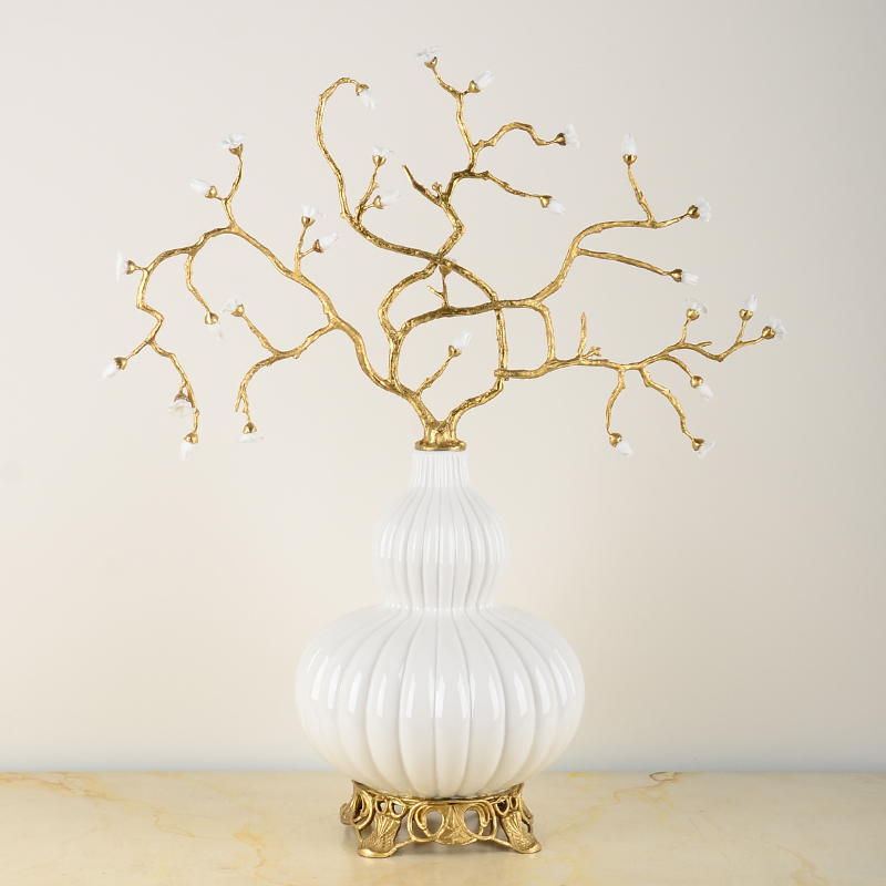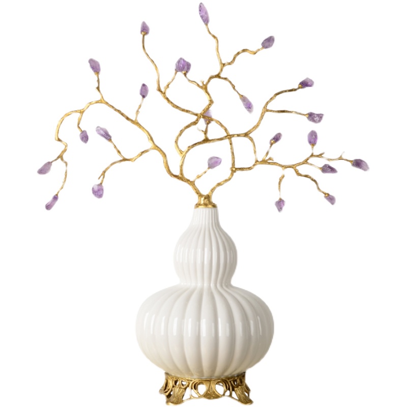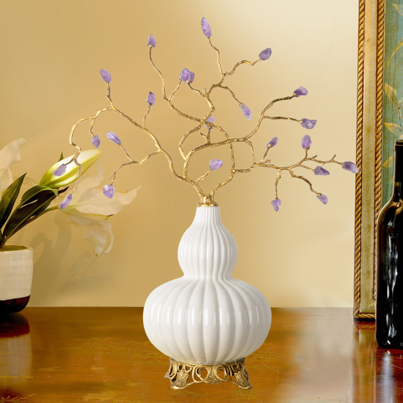 欧式奢华古典葫芦形铜配陶瓷紫水晶石花枝摆件客厅玄关高档装饰品