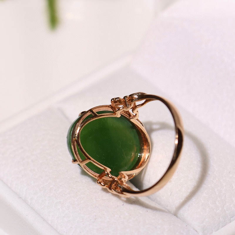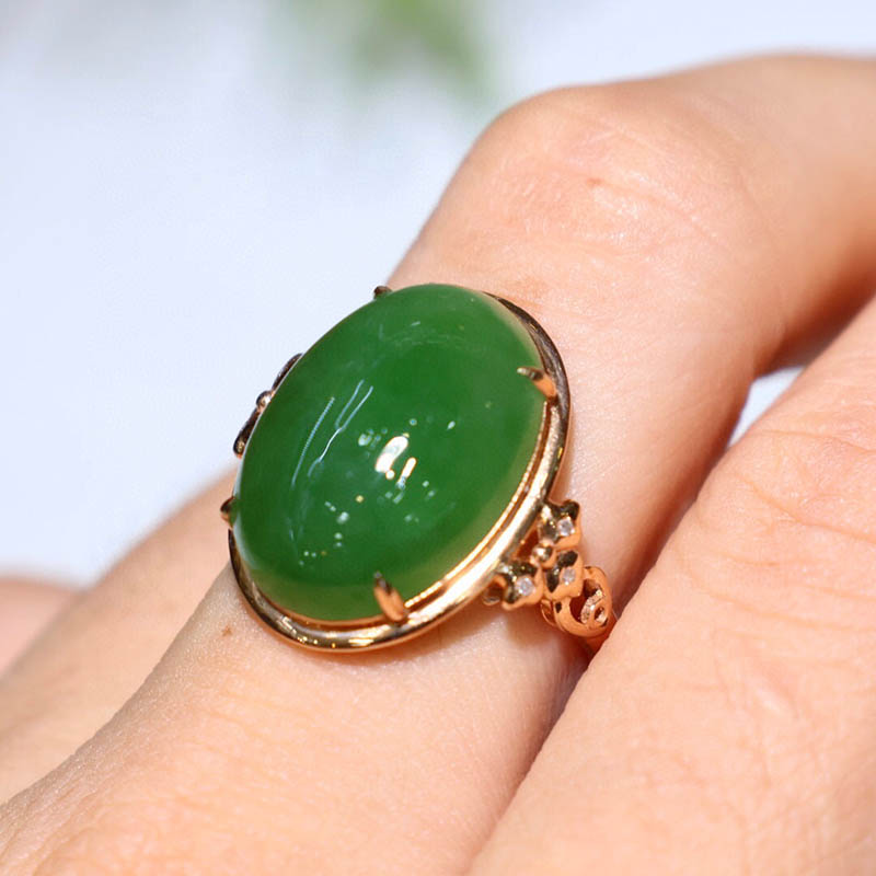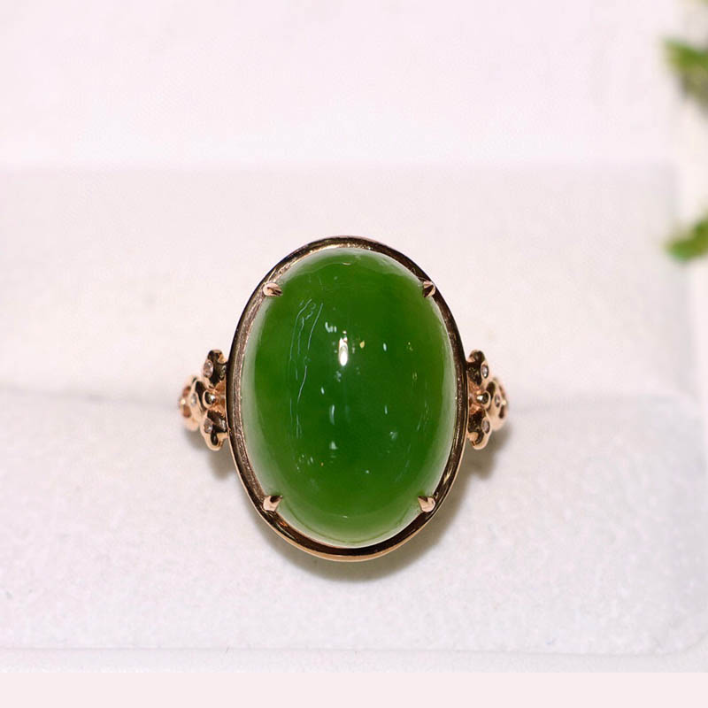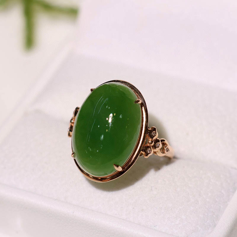 618特惠天然和田玉指环女正宗菠菜绿碧玉蛋面镶嵌18k金戒指送老婆