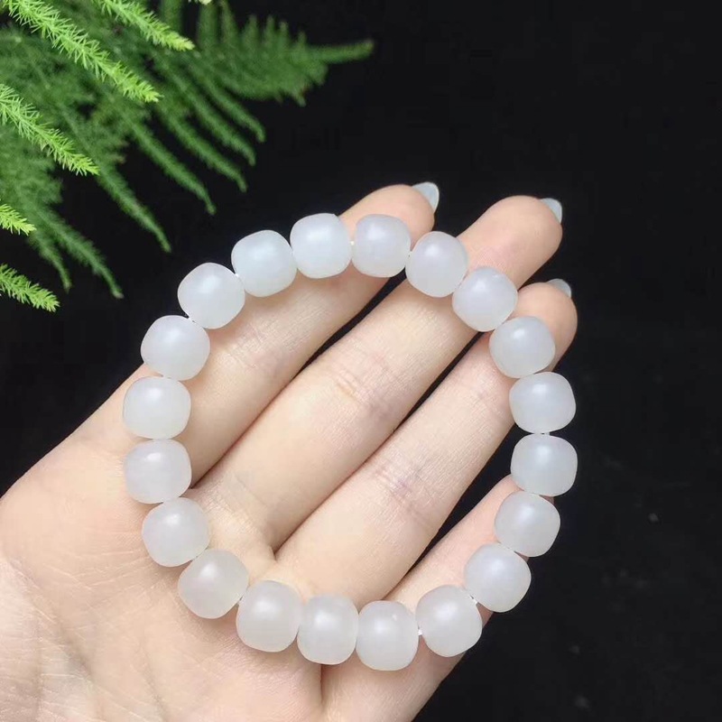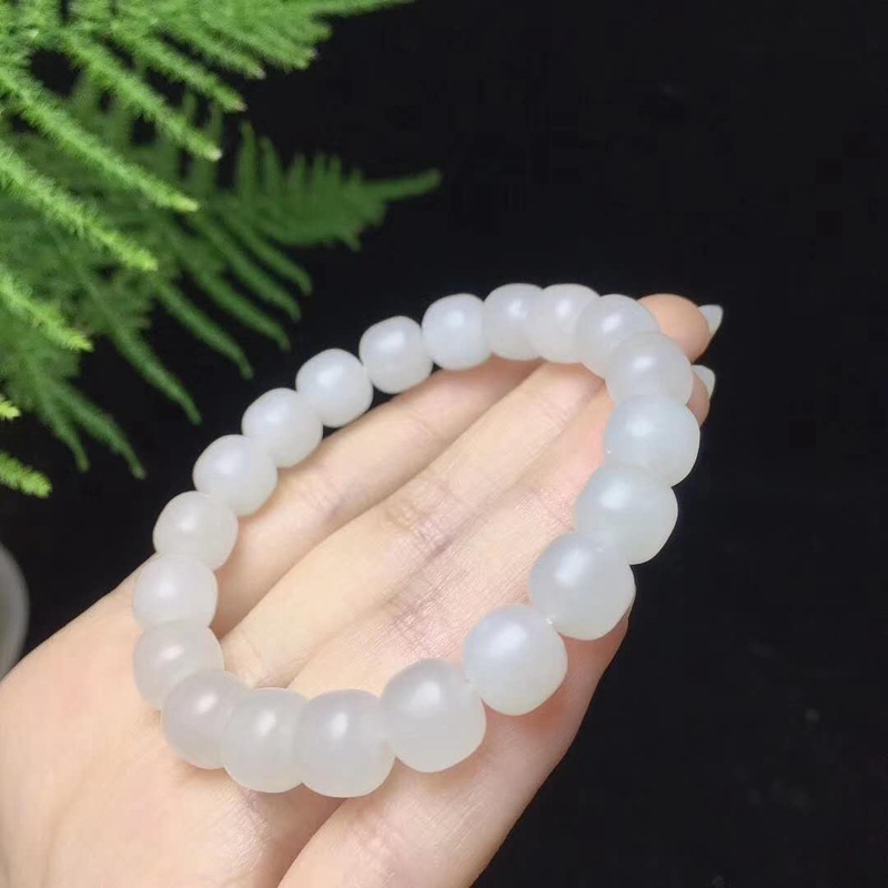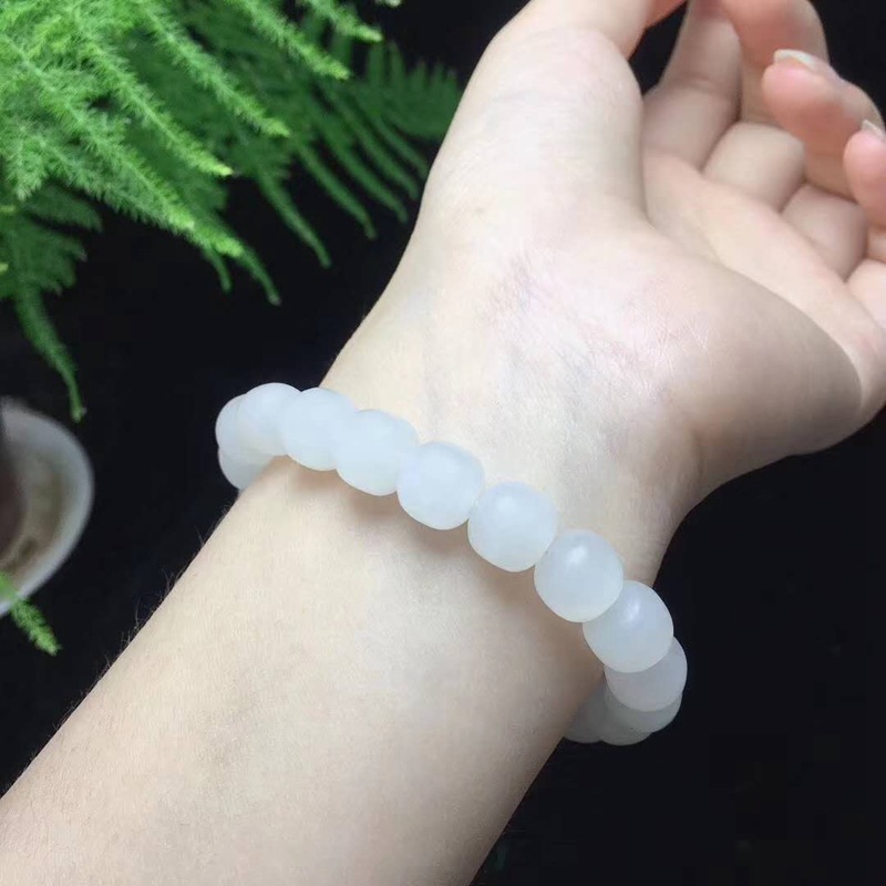 和田玉白玉手链圆珠磨砂单圈手链吊坠简约时尚女款手串青海