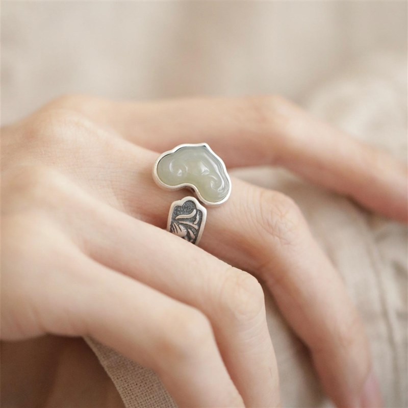925银新中式复古做旧民s族风和田玉如意戒指环开口调节简约高级感