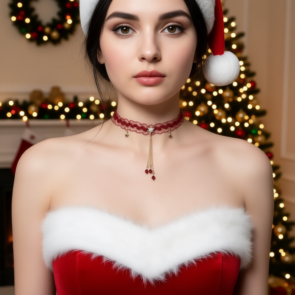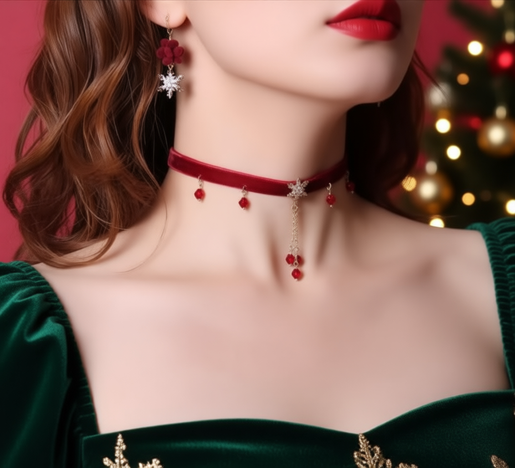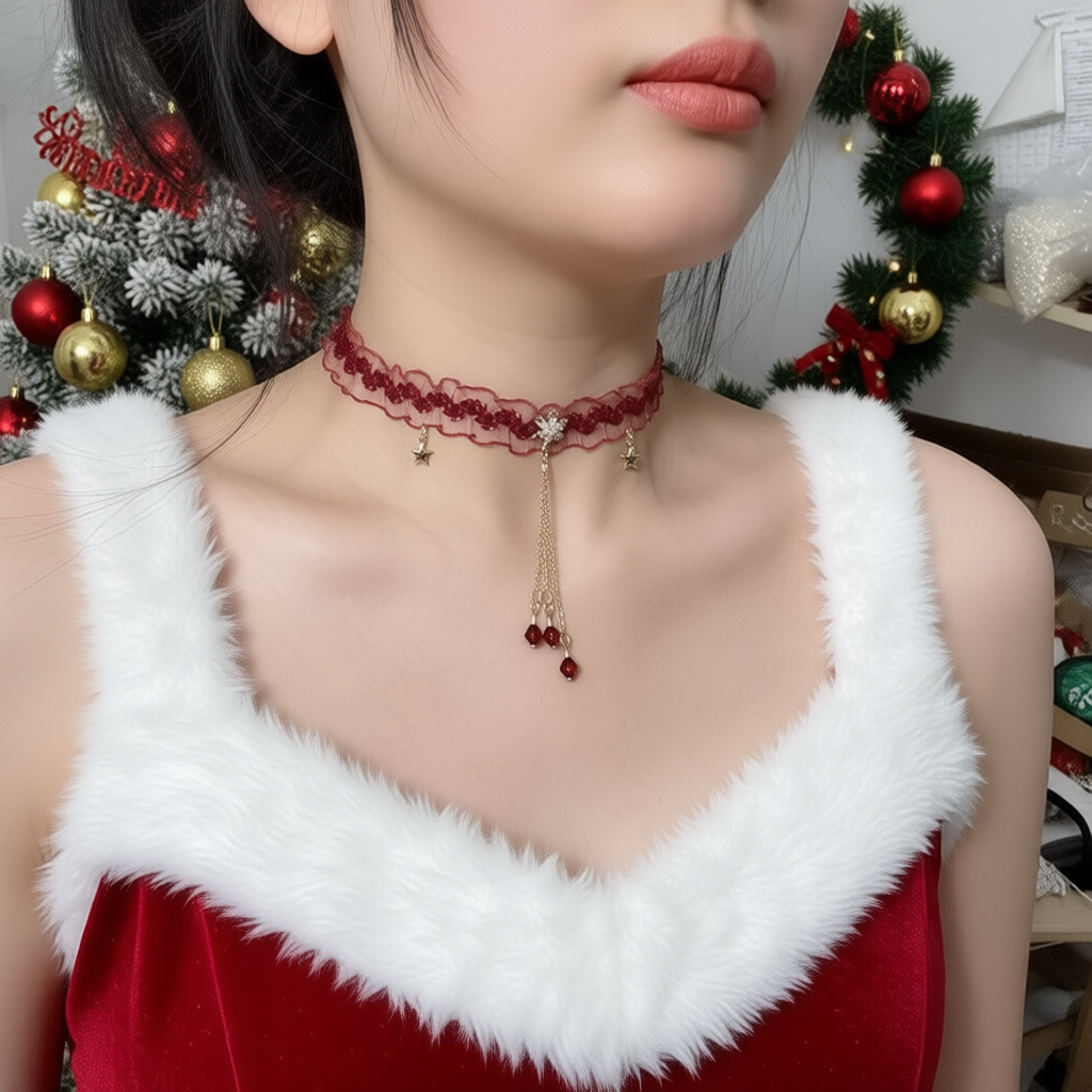 欧美跨境新款女士丝绒项圈颈链红色颈带圣诞节配饰新年choker流苏