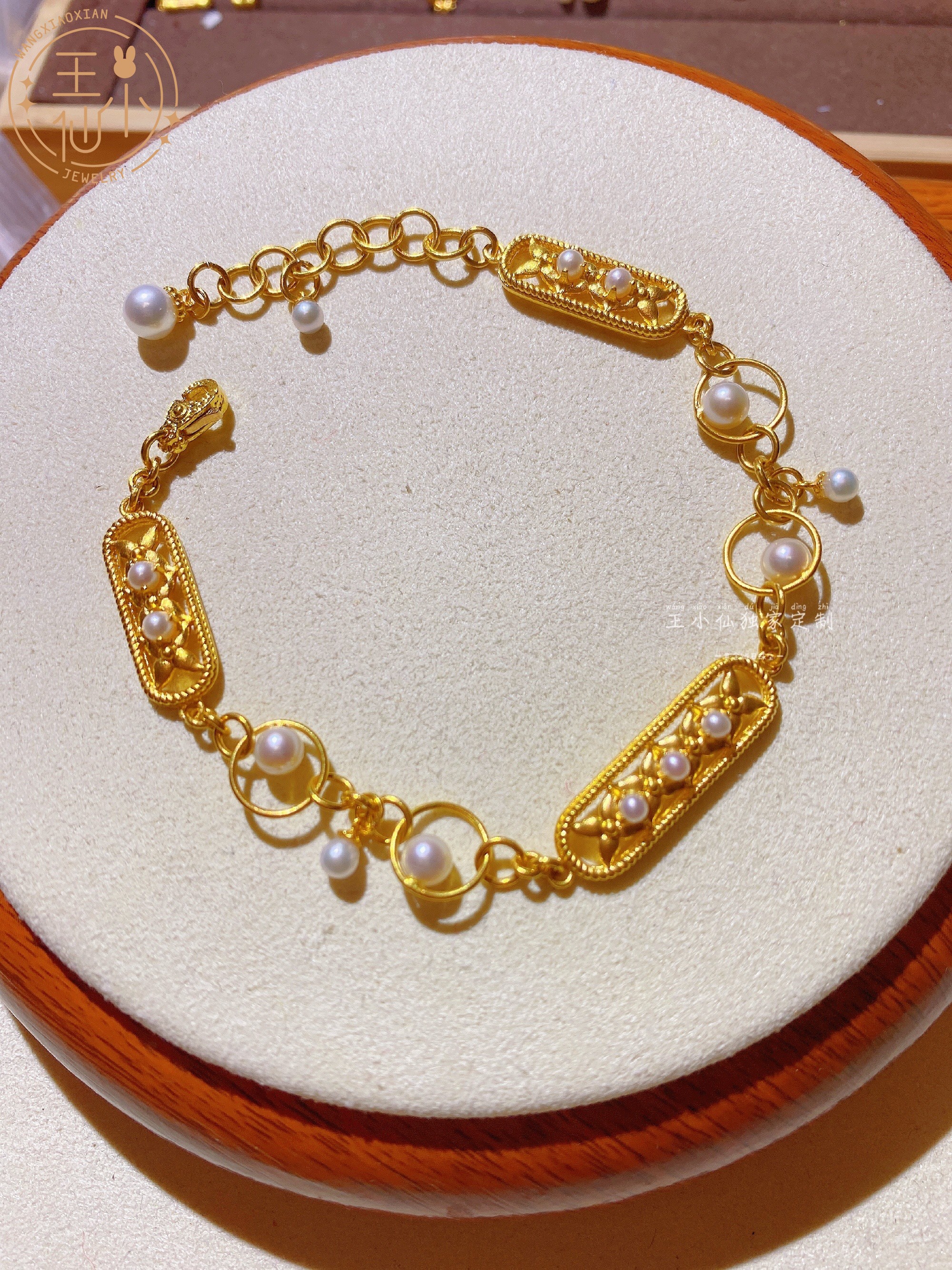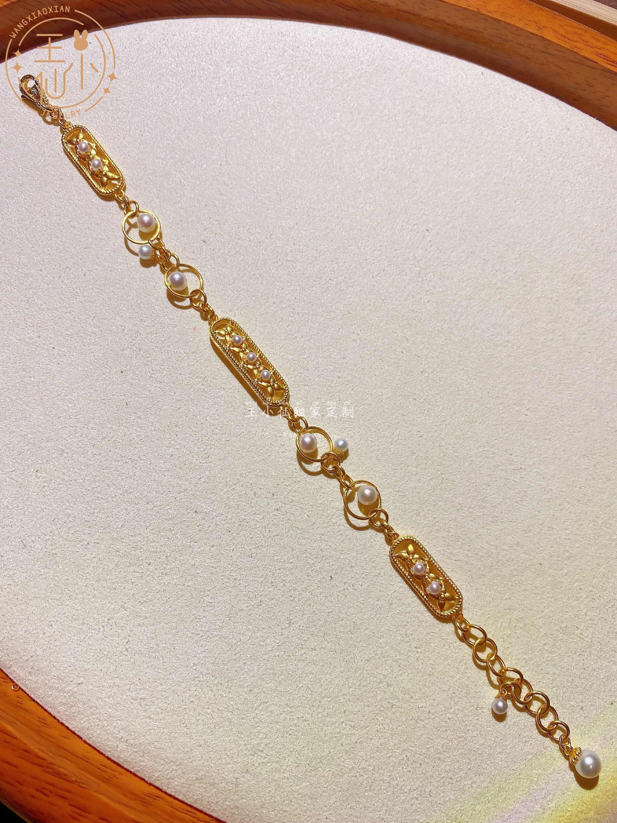 独家新作 999足金 手工古法金 天然珍珠 镶嵌 栀子花开 黄金手链