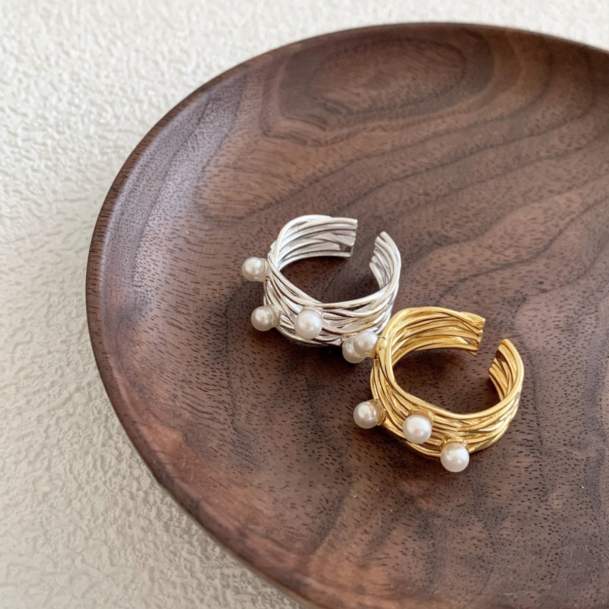 甜酷多层线条缠绕珍珠戒指女优雅时尚个性气质S925镀银开口食指环