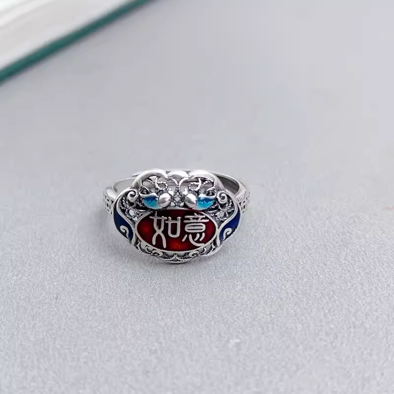 纯银招财转运烧蓝珐琅如意锁锦鲤戒指复古风旗袍国潮汉服开口指环
