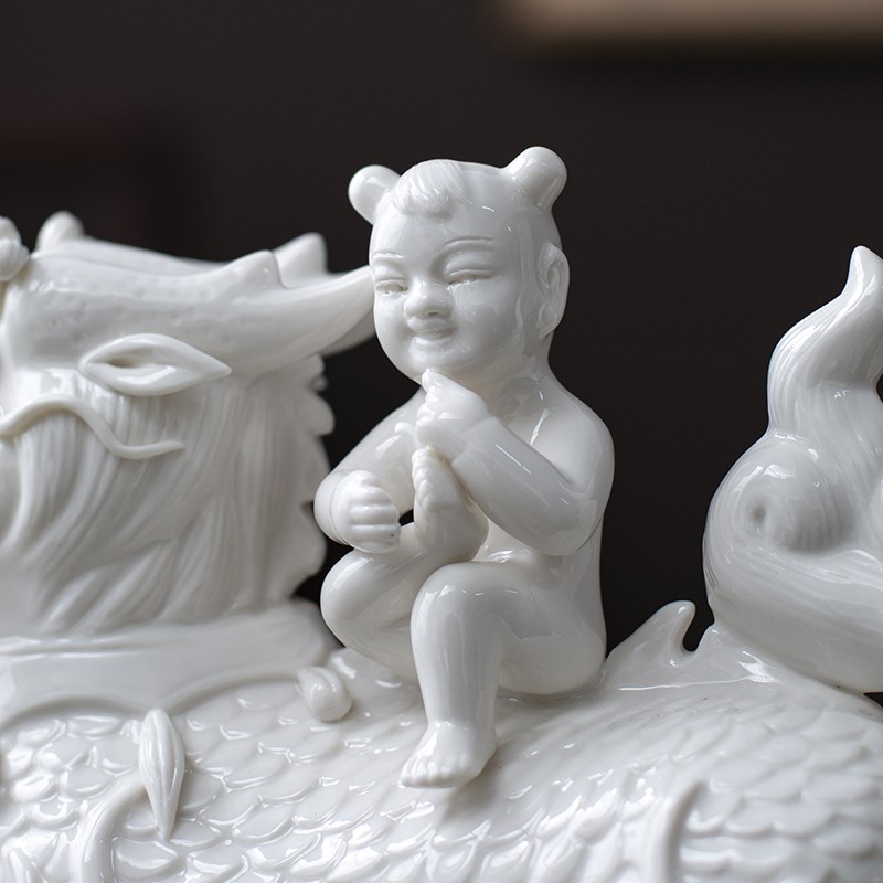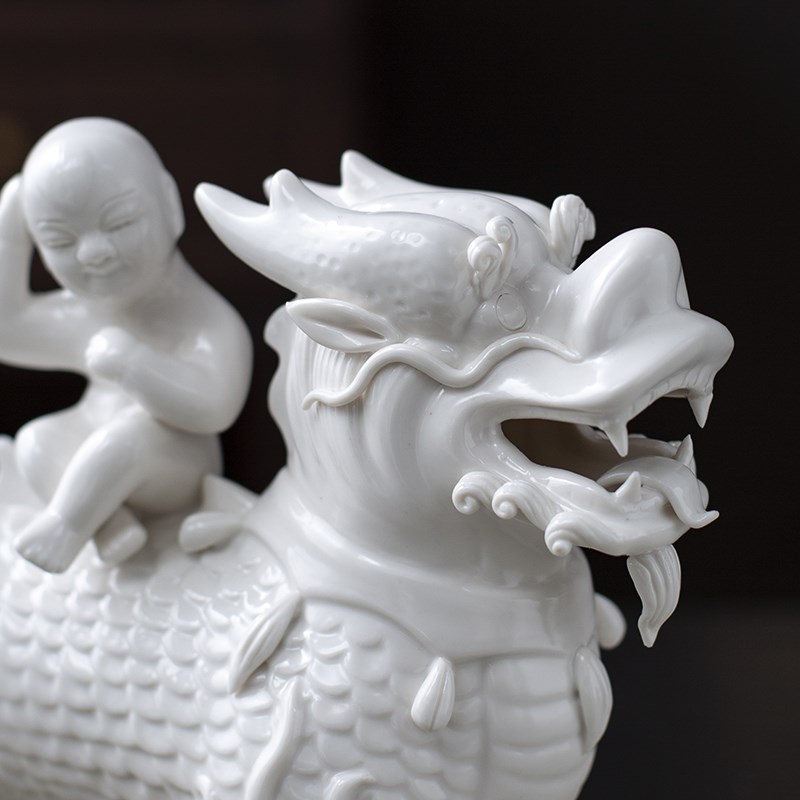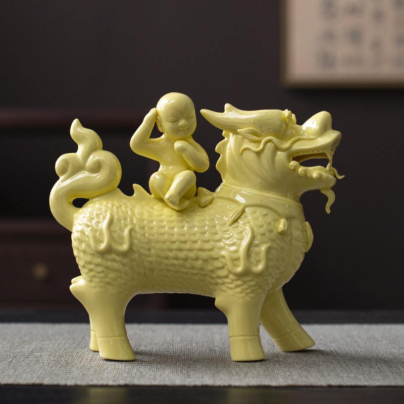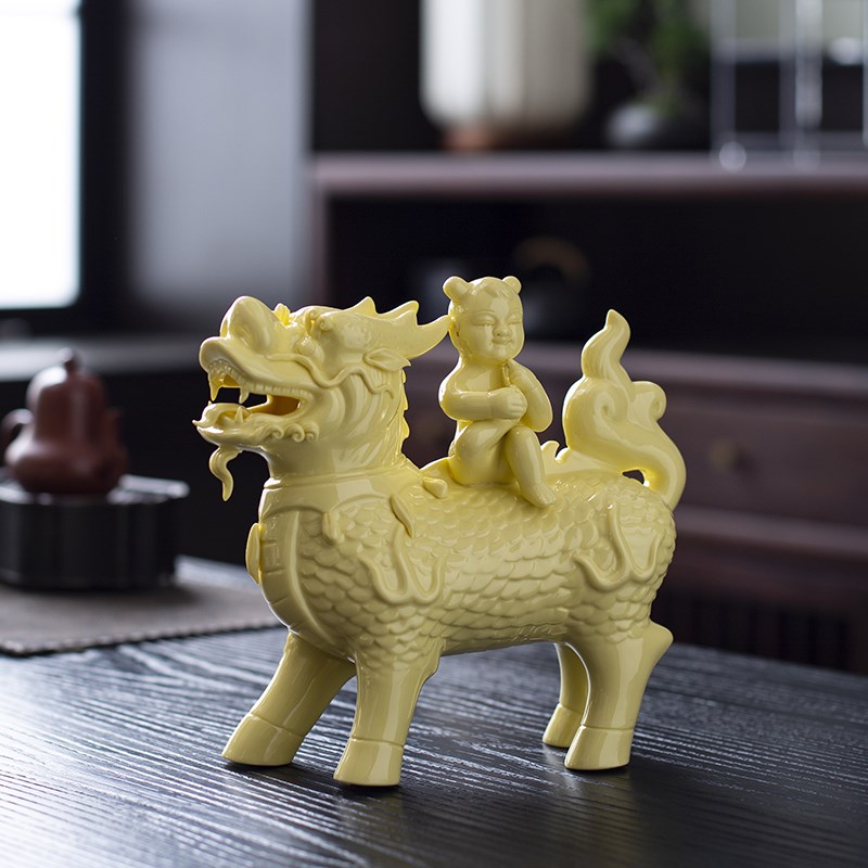 黄色陶瓷麒麟摆件一对工艺品家用客厅卧室瓷器火麒麟X送子饰品招