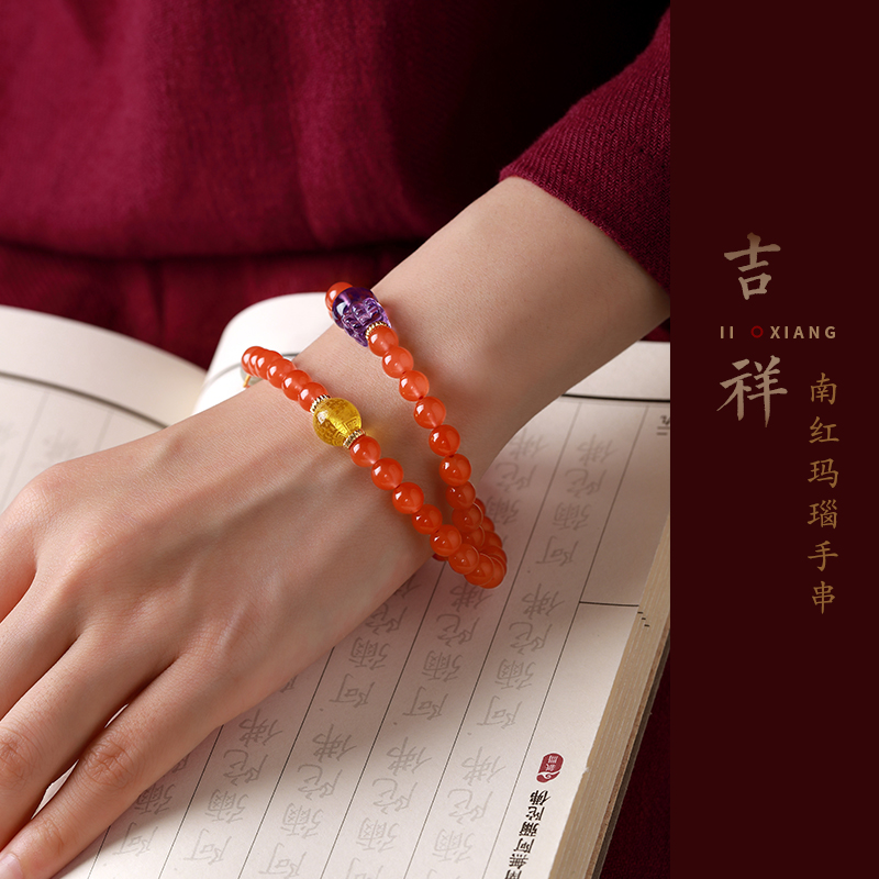 南红玛瑙手串女红肉双层蜜蜡心经佩珠紫水晶貔貅银镶翡翠葫芦手链