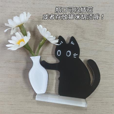 小黑猫推花瓶摆件桌面办公室可爱治愈系装饰亚克力磁吸冰箱贴立牌