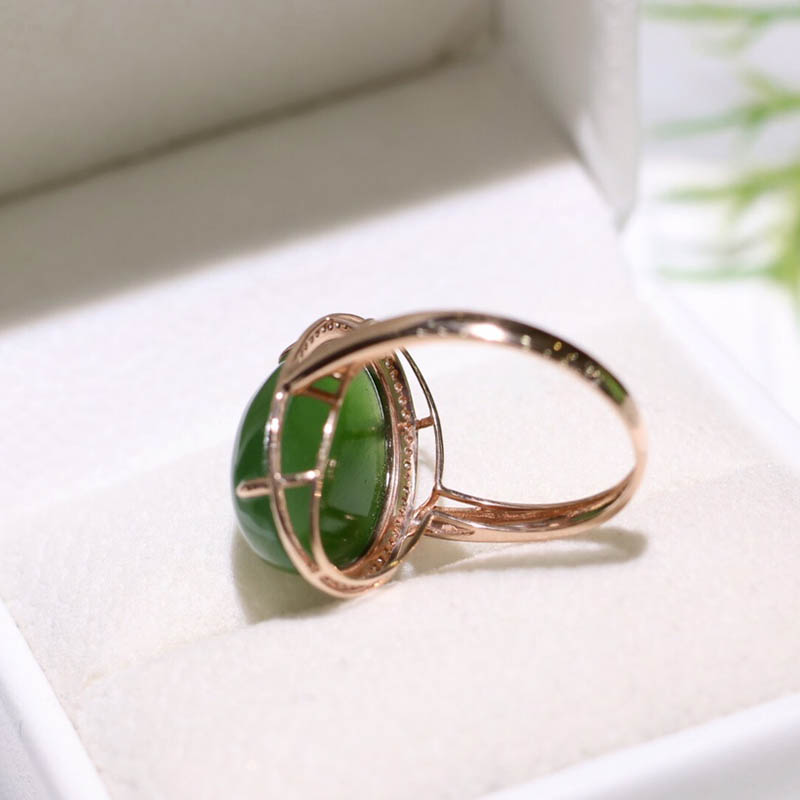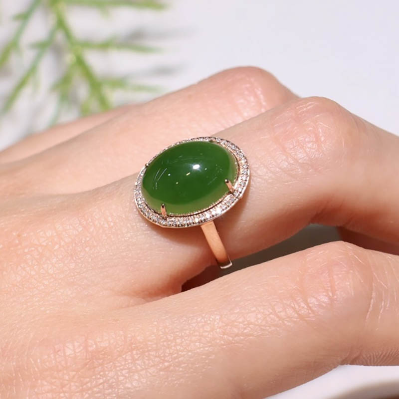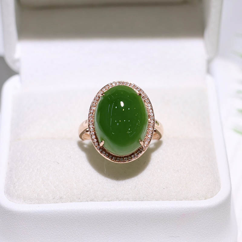 双旦活动天然和田玉指环时尚潮流满钻碧玉蛋面镶18k金指环送妈妈