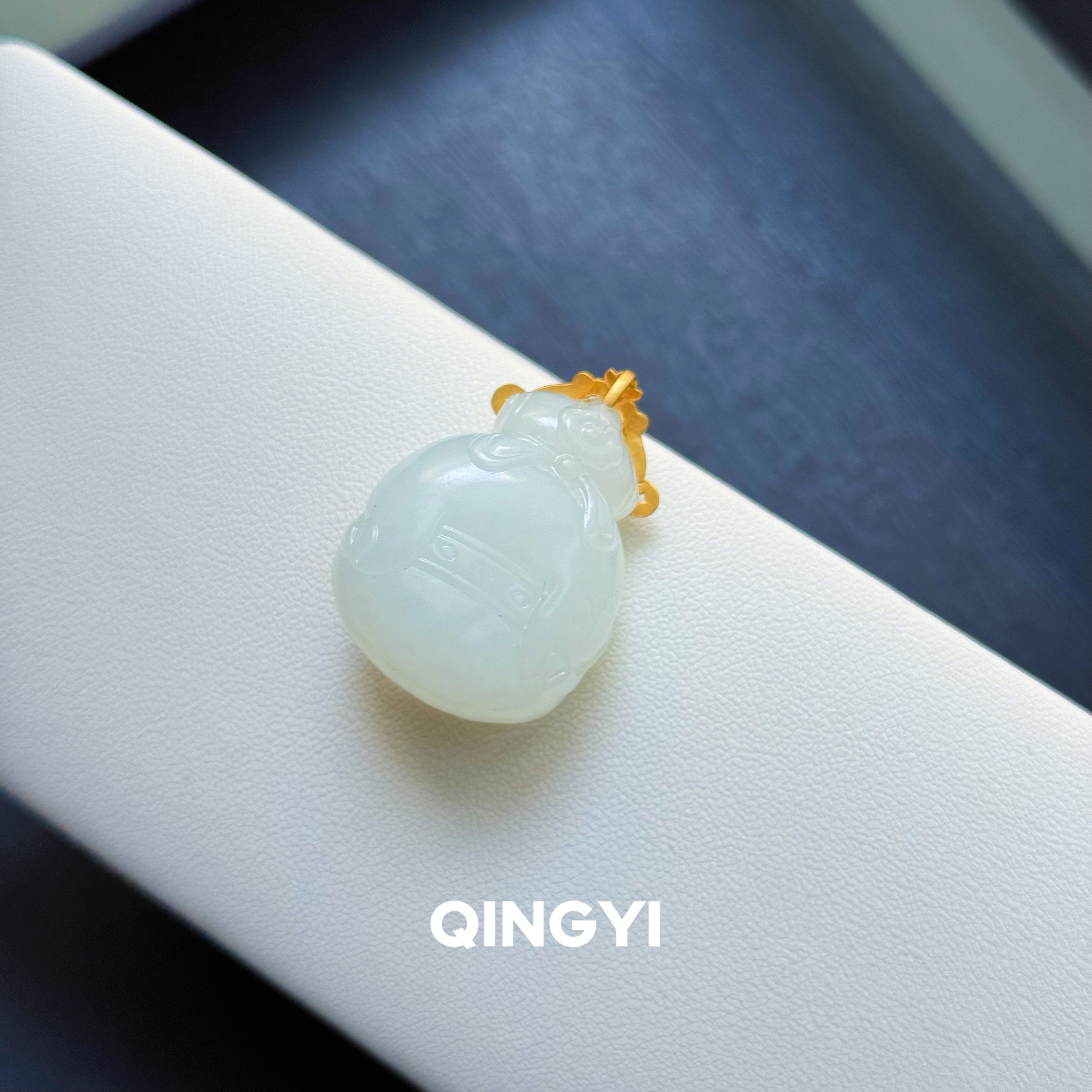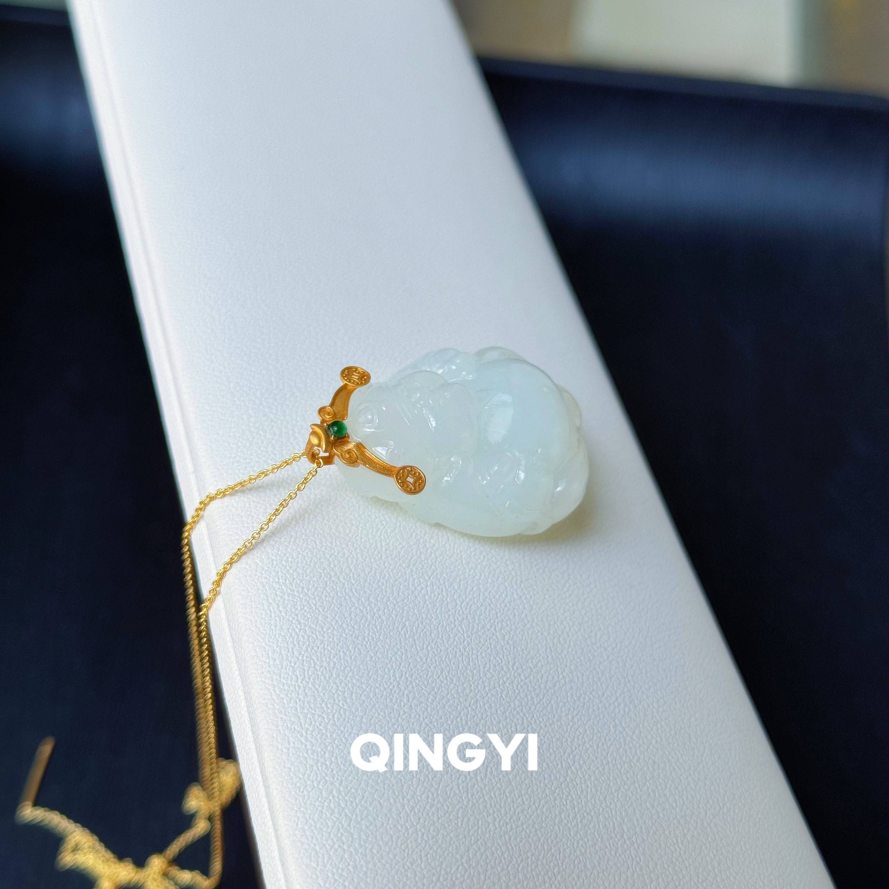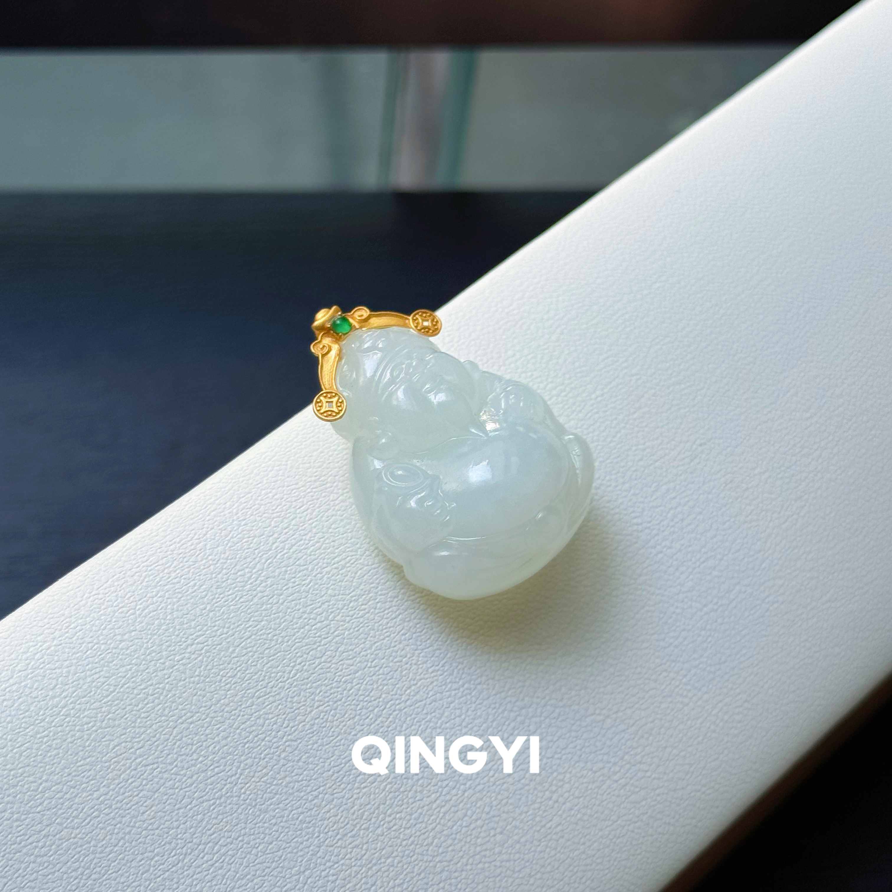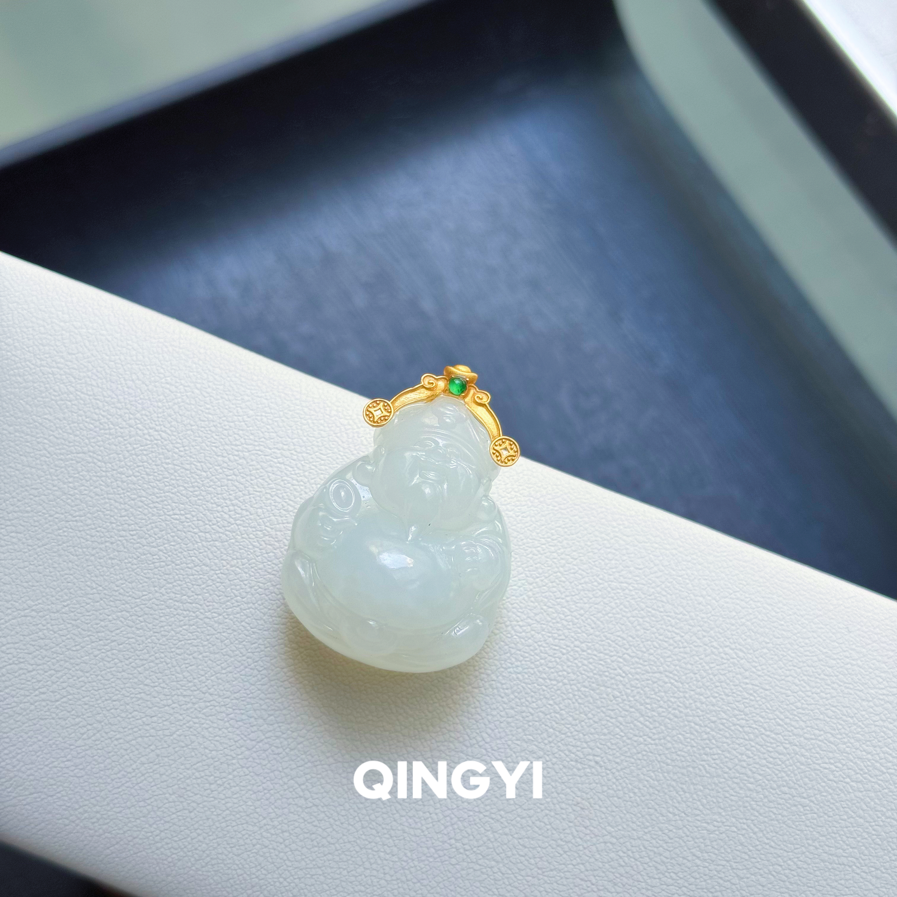天然俄料和田玉白玉财神爷吊坠18K金女款玉石挂件玉坠送朋友礼物
